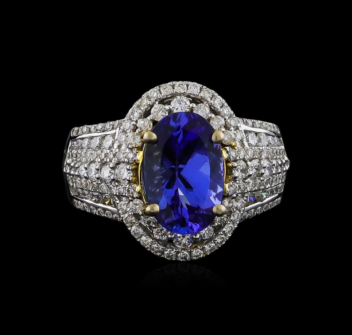 One electronically tested 14KT white and yellow gold ladies combination cast & assembled tanzanite and diamond ring with a tapered shank with a bright polish finish. Identified with markings of "14K". Condition is new. Containing: One prong set oval modified brilliant cut natural tanzanite, measuring 12.26 x 8.00 x 5.99mm, approximate weight of 4.12ct., clarity is eye clean, type I, medium, moderately strong, violet color, (GIA V 5/4), cut is good. Twenty-Eight prong set round brilliant cut diamonds, measuring 1.80 - 1.30 x 0.93mm (depth est.) approximate total weight of 28 Stones = 0.38ct. Clarity: I-1 to I-2. Color: J - K, Cut is Good. Colored gemstones are presumed to have been subjected to commonly used enhancement processes. All diamonds and colored gemstones are graded in the mounting, unless otherwise stated. Total Weight of Colored Stones 4.12ct. Total Weight of Diamonds 0.38ct. Total Weight of Ring 9.90 grams. GGL Appraised.