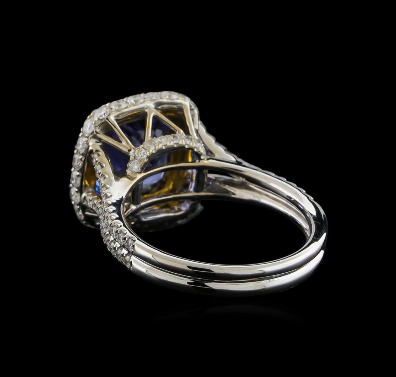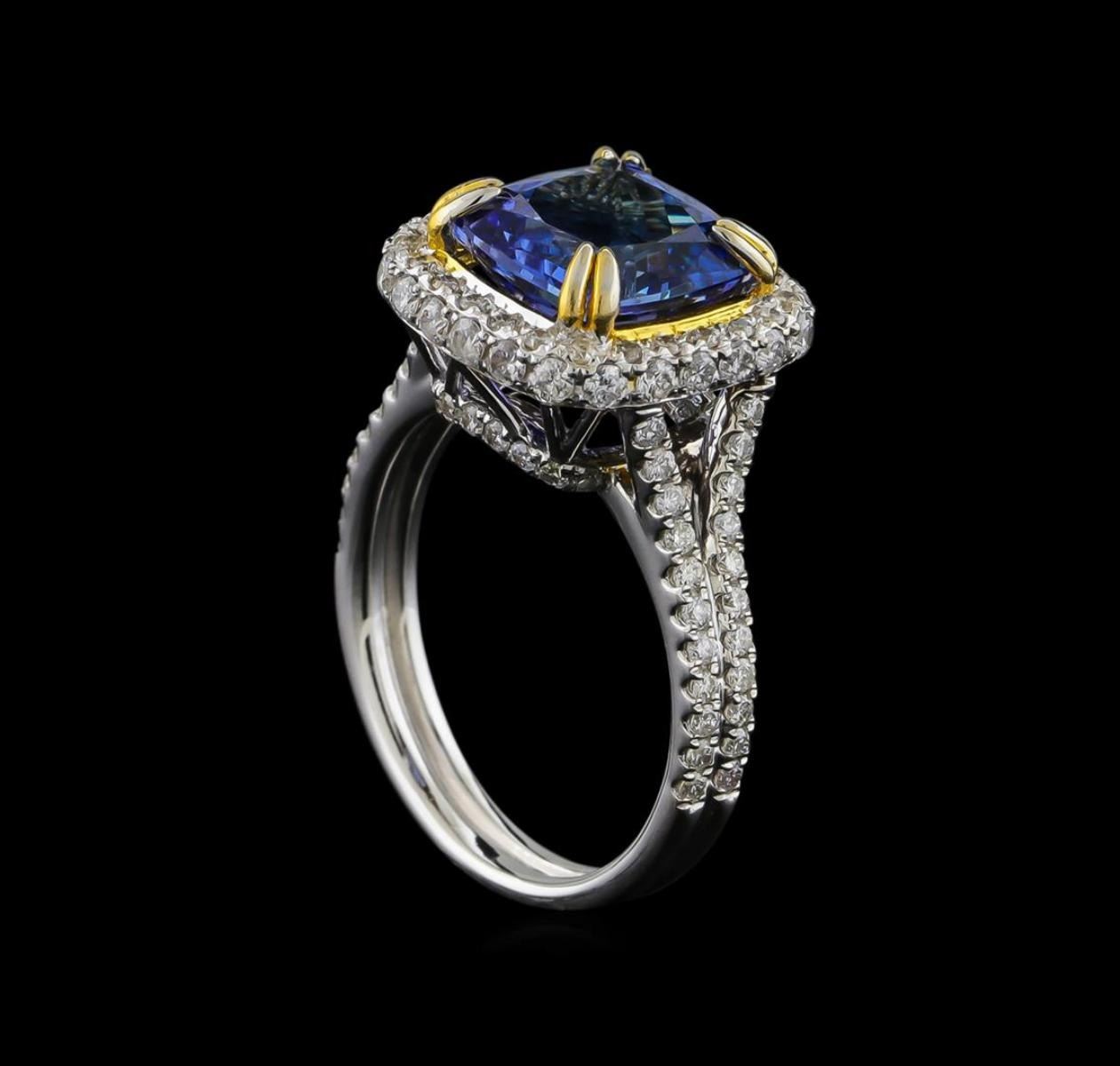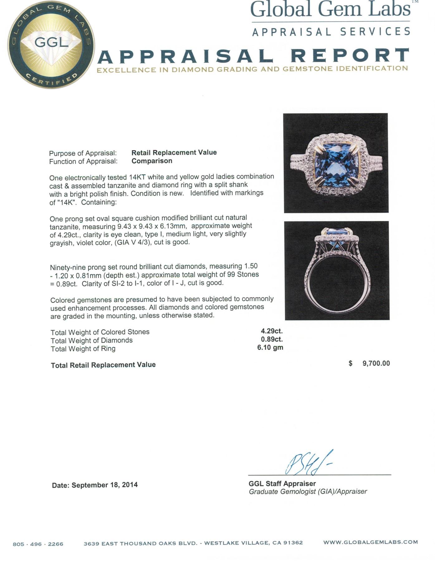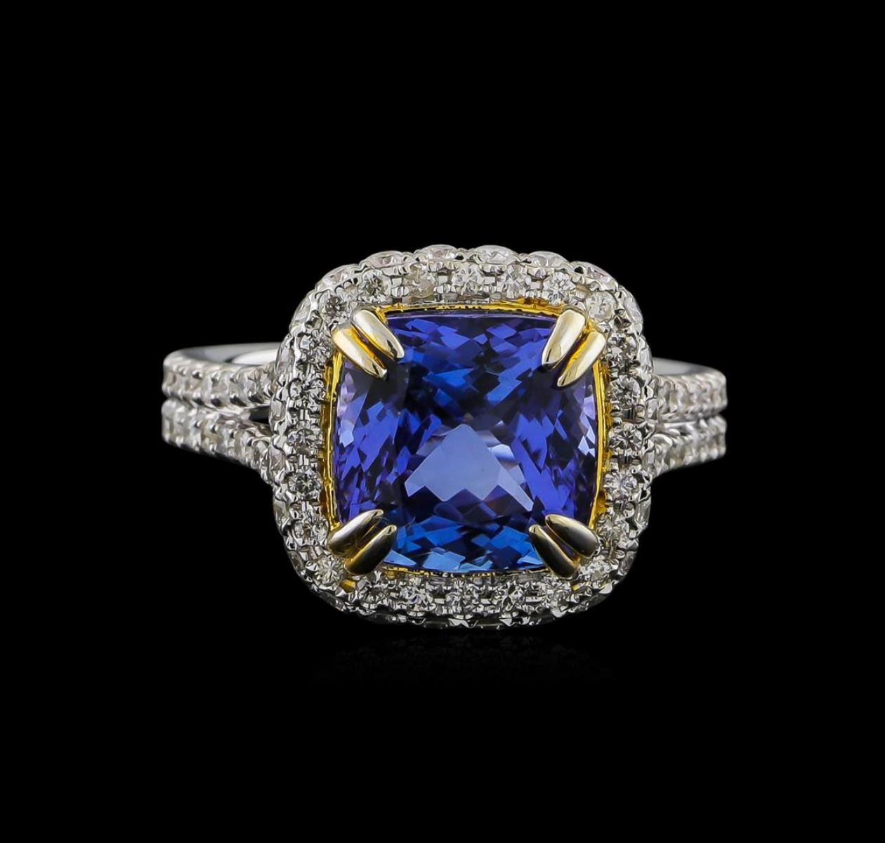 One electronically tested 14KT white and yellow gold ladies combination cast & assembled tanzanite and diamond ring with a split shank with a bright polish finish. Identified with markings of "14K". Condition is new. Containing: One prong set oval square cushion modified brilliant cut natural tanzanite, measuring 9.43 x 9.43 x 6.13mm, approximate weight of 4.29ct., clarity is eye clean, type I, medium light, very slightly grayish, violet color, (GIA V 4/3), cut is good. Ninety-Nine prong set round brilliant cut diamonds, measuring 1.50 - 1.20 x 0.81mm (depth est.) approximate total weight of 99 Stones = 0.89ct. Clarity: SI-2 to I-1. Color: I - J, Cut is Good. Colored gemstones are presumed to have been subjected to commonly used enhancement processes. All diamonds and colored gemstones are graded in the mounting, unless otherwise stated. Total Weight of Colored Stones 4.29ct. Total Weight of Diamonds 0.89ct. Total Weight of Ring 6.10 grams. GGL Appraised at $9,700.00.