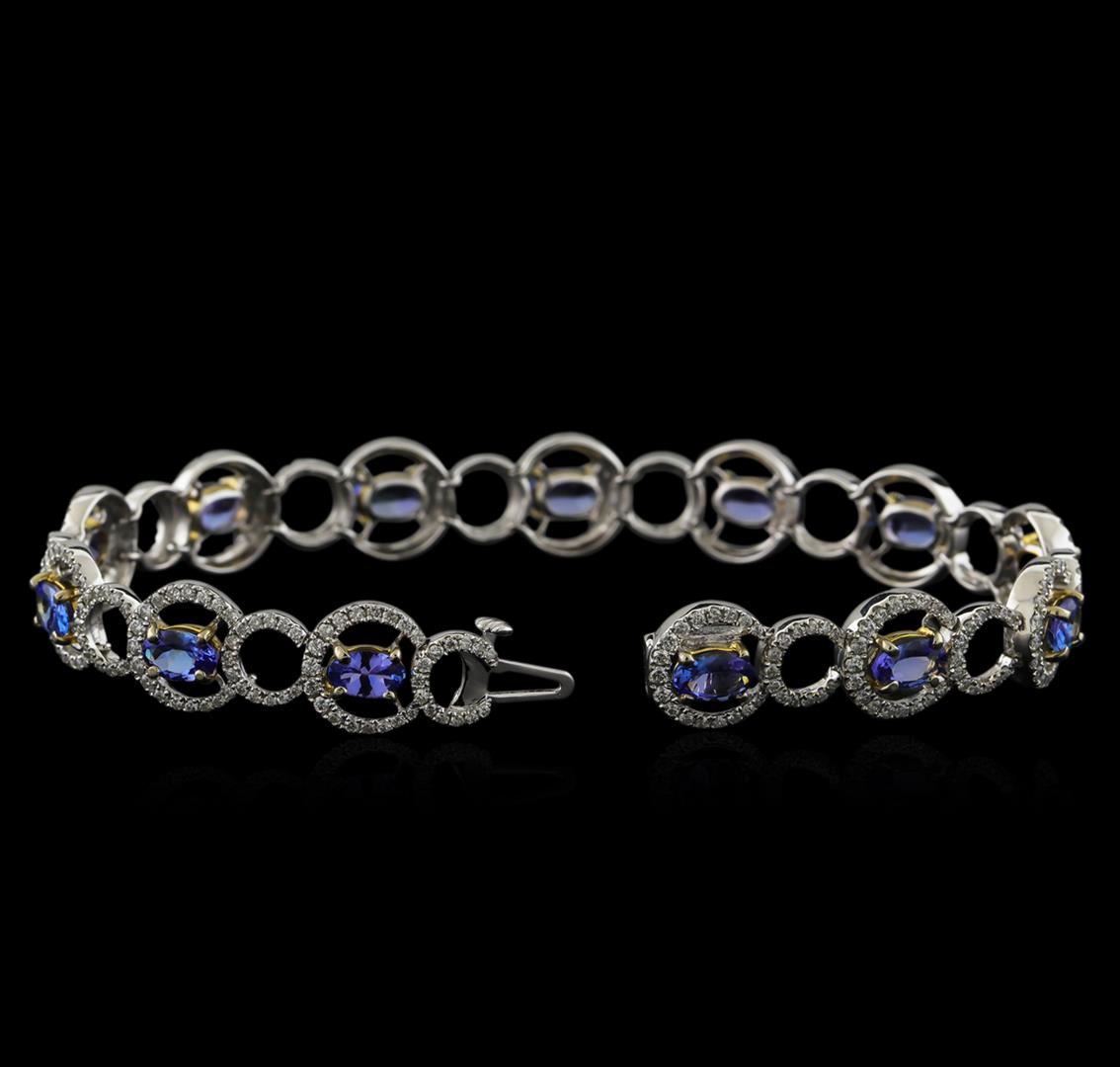 One electronically tested 14KT white and yellow gold ladies combination cast & assembled tanzanite and diamond bracelet with a hidden box clasp with a bright polish finish. Measurements: 7.25" in length. Condition is new. Containing: Thirteen prong set oval modified brilliant cut natural tanzanites, measuring 6.13 x 3.86 x 2.36mm, approximate total weight of 5.07ct., clarity is eye clean, type I, medium light, very slightly grayish, violet color, (GIA V 4/3), cut is very good. Five Hundred Twenty prong set round brilliant cut diamonds, measuring 1.00 - 1.00 x 0.60mm (depth est.) approximate total weight of 520 Stones = 1.87ct. Clarity: I-1 to I-2. Color: I - J, Cut is Good. Colored gemstones are presumed to have been subjected to commonly used enhancement processes. All diamonds and colored gemstones are graded in the mounting, unless otherwise stated. Total Weight of Colored Stones 5.07ct. Total Weight of Diamonds 1.87ct. Total Weight of Bracelet 15.60 grams. GGL Appraised at $12,580.00.