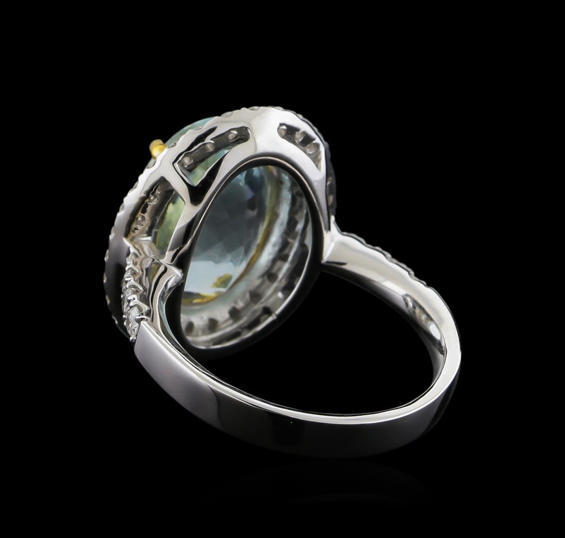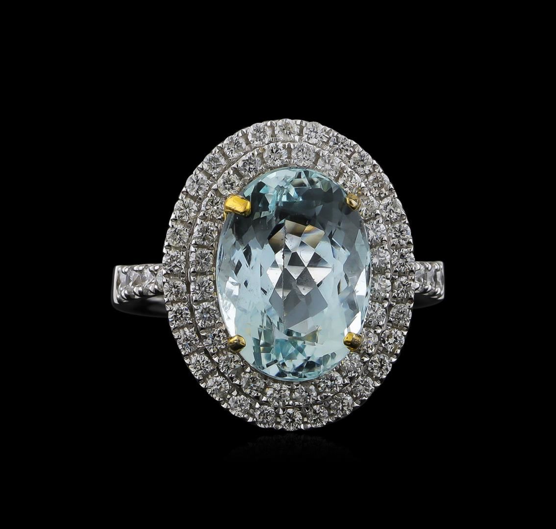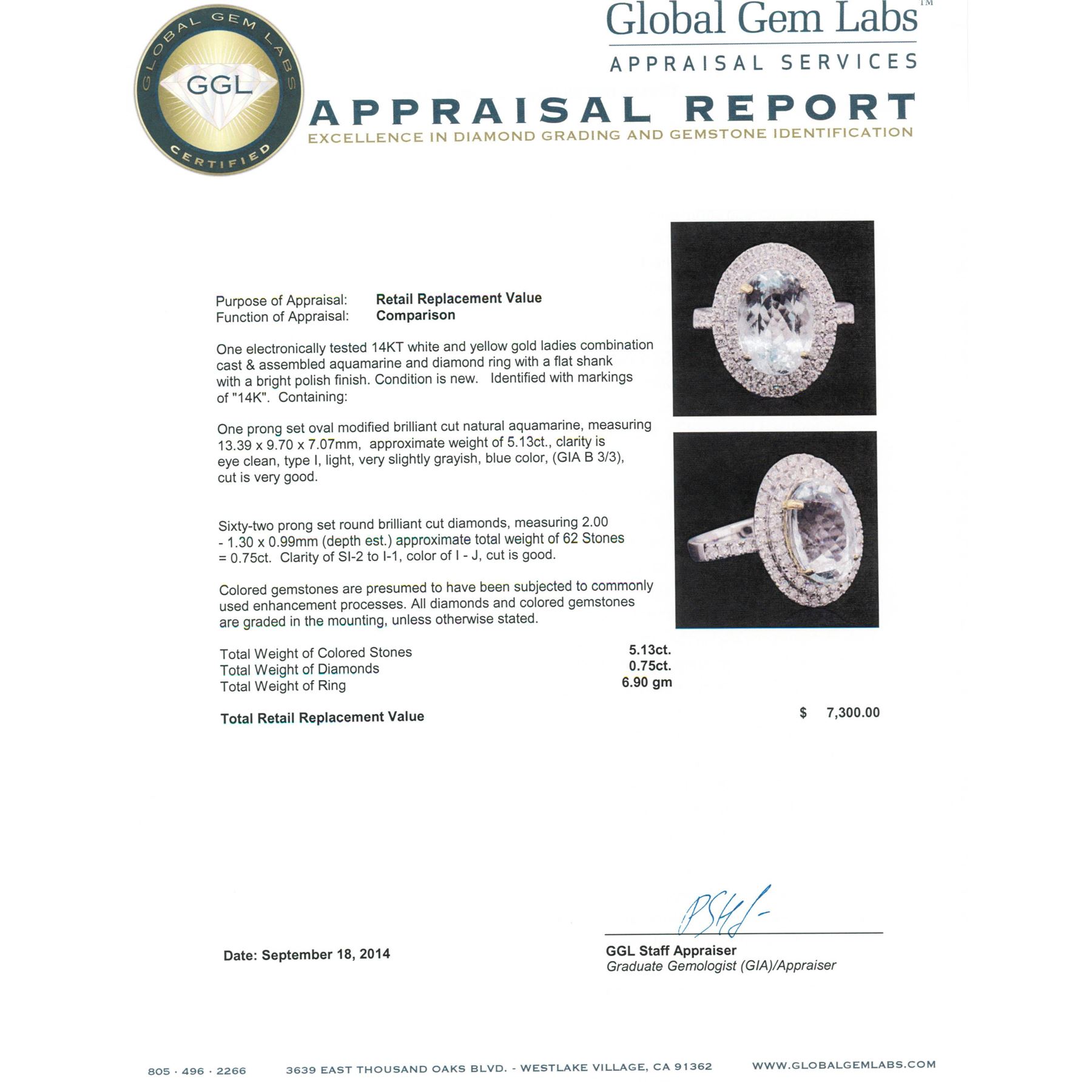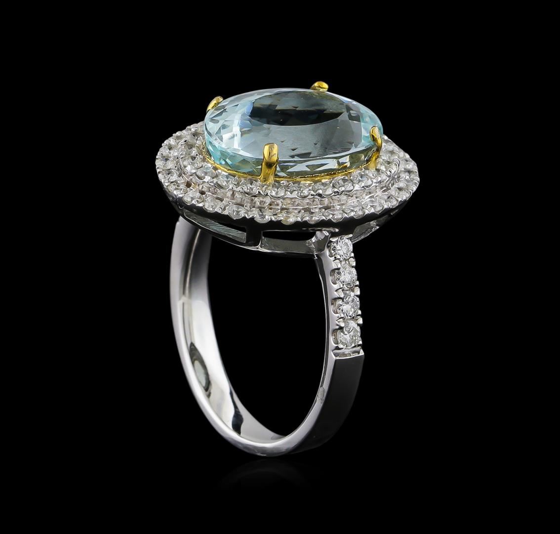 One electronically tested 14KT white and yellow gold ladies combination cast & assembled aquamarine and diamond ring with a flat shank with a bright polish finish. Identified with markings of "14K". Condition is new. Containing: One prong set oval modified brilliant cut natural aquamarine, measuring 13.39 x 9.70 x 7.07mm, approximate weight of 5.13ct., clarity is eye clean, type I, light, very slightly grayish, blue color, (GIA B 3/3), cut is very good. Sixty-Two prong set round brilliant cut diamonds, measuring 2.00 - 1.30 x 0.99mm (depth est.) approximate total weight of 62 Stones = 0.75ct. Clarity: SI-2 to I-1. Color: I - J, Cut is Good. Colored gemstones are presumed to have been subjected to commonly used enhancement processes. All diamonds and colored gemstones are graded in the mounting, unless otherwise stated. Total Weight of Colored Stones 5.13ct. Total Weight of Diamonds 0.75ct. Total Weight of Ring 6.90 grams. GGL Appraised.