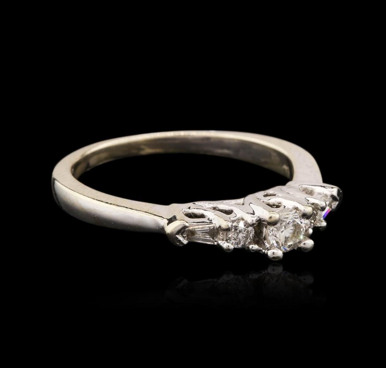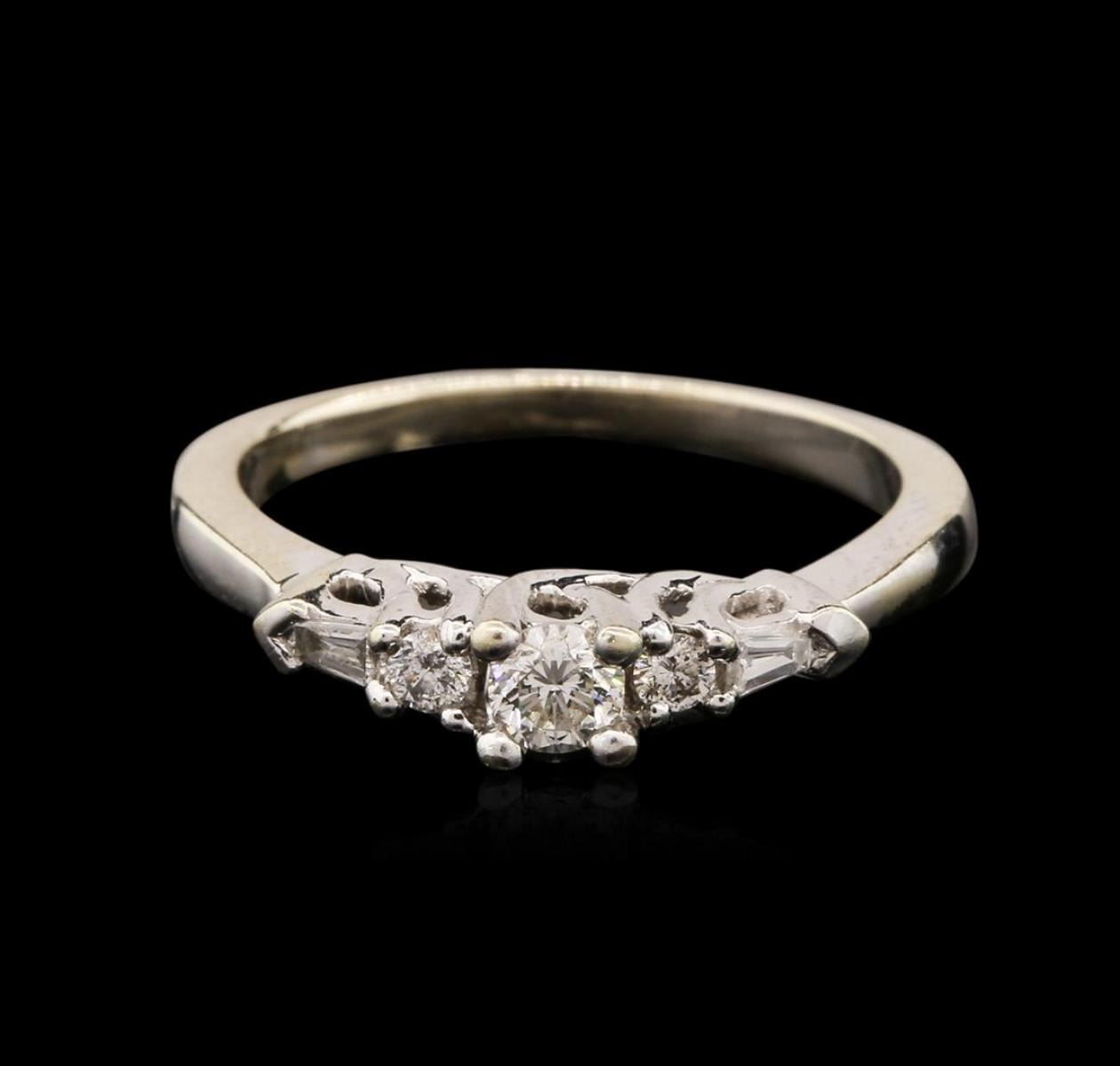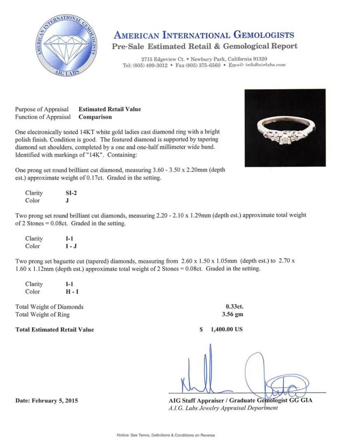 One electronically tested 14KT white gold ladies cast diamond ring with a bright polish finish. The featured diamond is supported by tapering diamond set shoulders, completed by a one and one-half millimeter wide band. Identified with markings of "14K". Condition is good. Containing: One prong set round brilliant cut diamond, measuring 3.60 - 3.50 x 2.20mm (depth est.) approximate weight of 0.17ct. Graded in the setting. Clarity: SI-2. Color: J Two prong set round brilliant cut diamonds, measuring 2.20 - 2.10 x 1.29mm (depth est.) approximate total weight of 2 Stones = 0.08ct. Graded in the setting. Clarity: I-1. Color: I - J Two prong set baguette cut (tapered) diamonds, measuring from 2.60 x 1.50 x 1.05mm (depth est.) to 2.70 x 1.60 x 1.12mm (depth est.) approximate total weight of 2 Stones = 0.08ct. Graded in the setting. Clarity: I-1. Color: H - I. Total Weight of Diamonds 0.33ct. Total Weight of Ring 3.56 grams. AIG Appraised at $1,400.00.