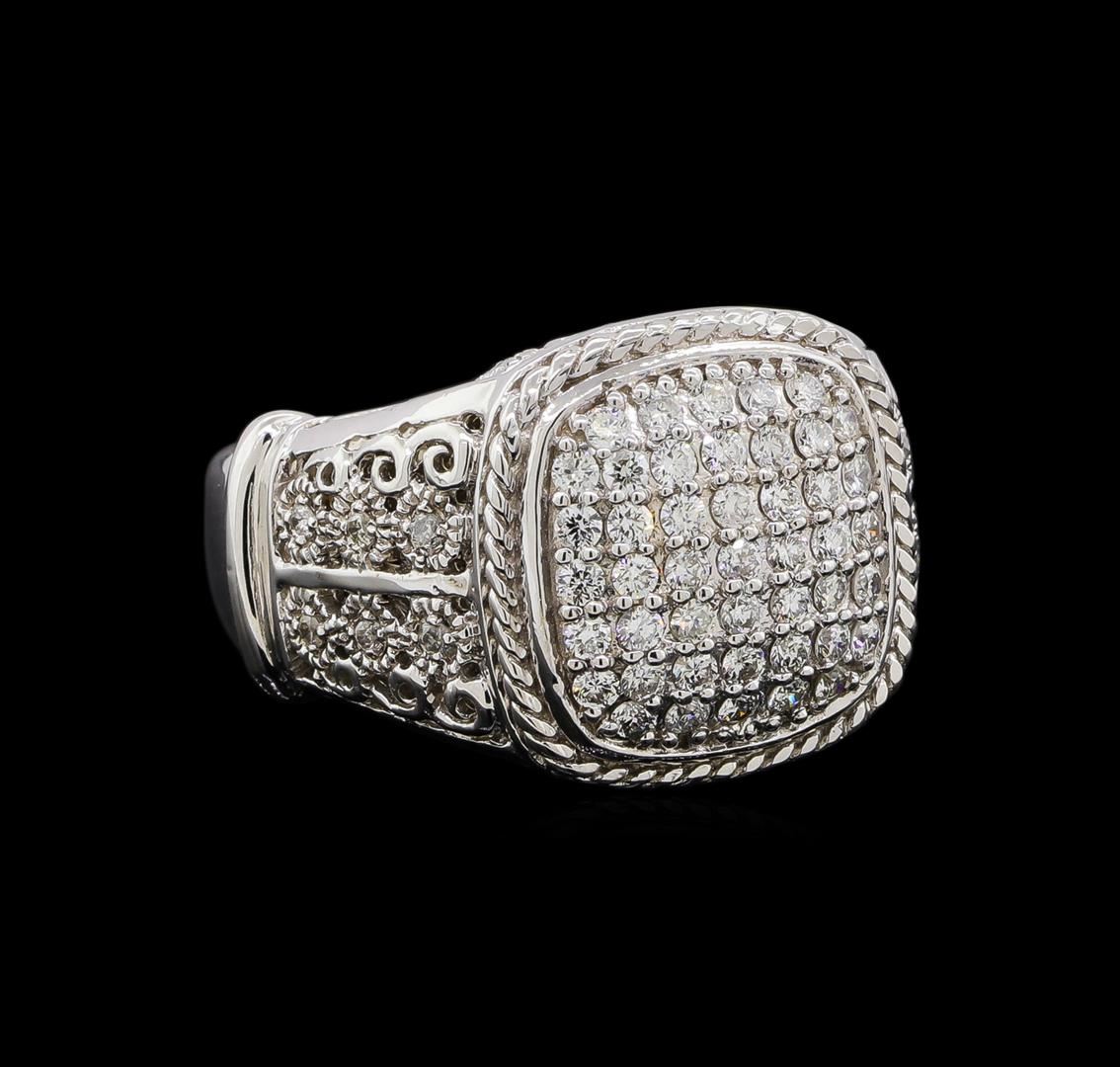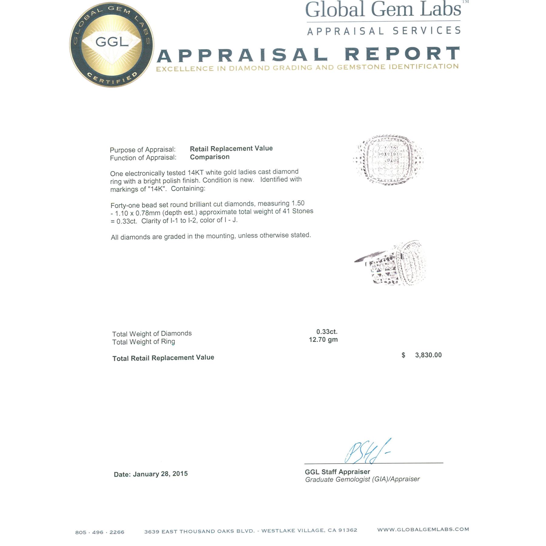 One electronically tested 14KT white gold ladies cast diamond ring with a bright polish finish. Identified with markings of "14K". Condition is new. Containing: Forty-One bead set round brilliant cut diamonds, measuring 1.50 - 1.10 x 0.78mm (depth est.) approximate total weight of 41 Stones = 0.33ct. Clarity: I-1 to I-2. Color: I - J. All diamonds are graded in the mounting, unless otherwise stated. Total Weight of Diamonds 0.33ct. Total Weight of Ring 12.70 grams. GGL Appraised.