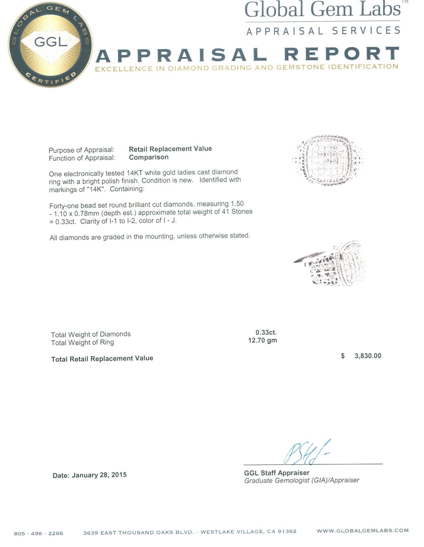 One electronically tested 14KT white gold ladies cast diamond ring with a bright polish finish. Identified with markings of "14K". Condition is new. Containing: Forty-One bead set round brilliant cut diamonds, measuring 1.50 - 1.10 x 0.78mm (depth est.) approximate total weight of 41 Stones = 0.33ct. Clarity: I-1 to I-2. Color: I - J. All diamonds are graded in the mounting, unless otherwise stated. Total Weight of Diamonds 0.33ct. Total Weight of Ring 12.70 grams. GGL Appraised.