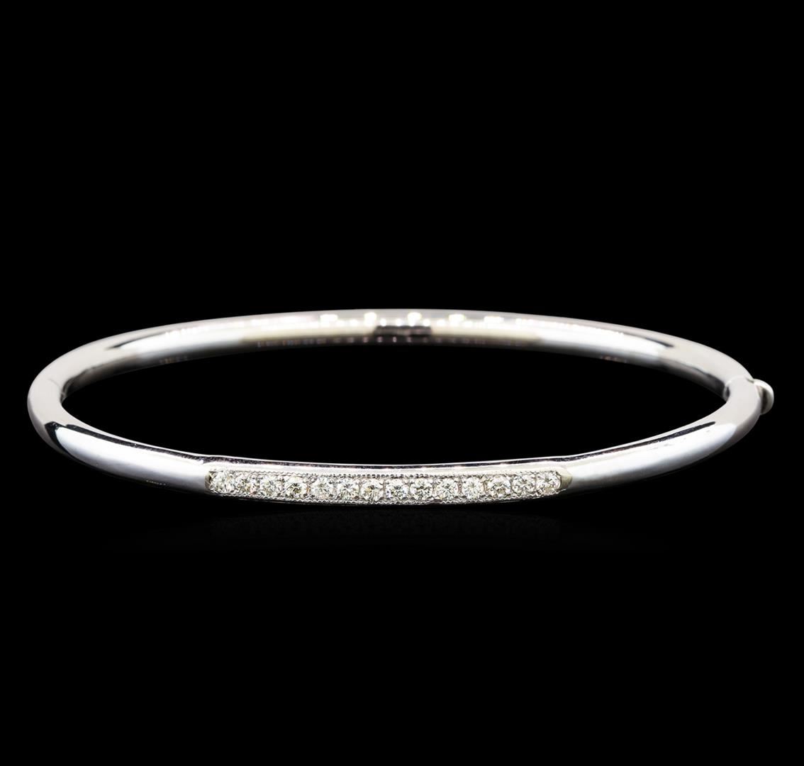 One electronically tested 14KT white gold ladies cast diamond bangle bracelet with a hidden box clasp with a bright polish finish. Identified with markings of "14K". Condition is new. Containing: Fourteen prong set round brilliant cut diamonds, measuring 1.90 - 1.90 x 1.14mm (depth est.) approximate total weight of 14 Stones = 0.39ct. Clarity: SI-1 to SI-2. Color: I - J, Cut is Good. All diamonds are graded in the mounting, unless otherwise stated. Total Weight of Diamonds 0.39ct. Total Weight of Bangle Bracelet 7.80 grams. GGL Appraised.