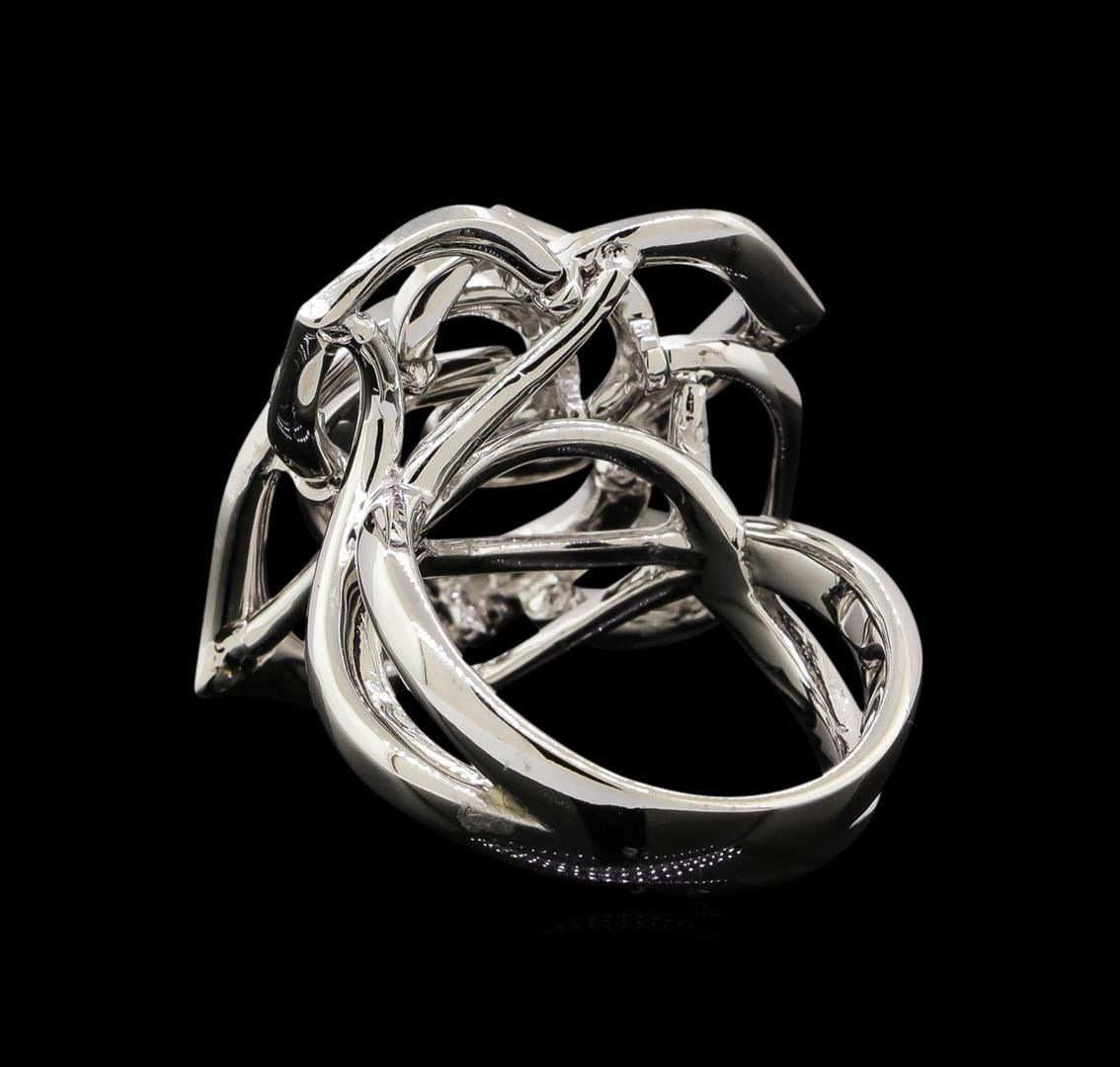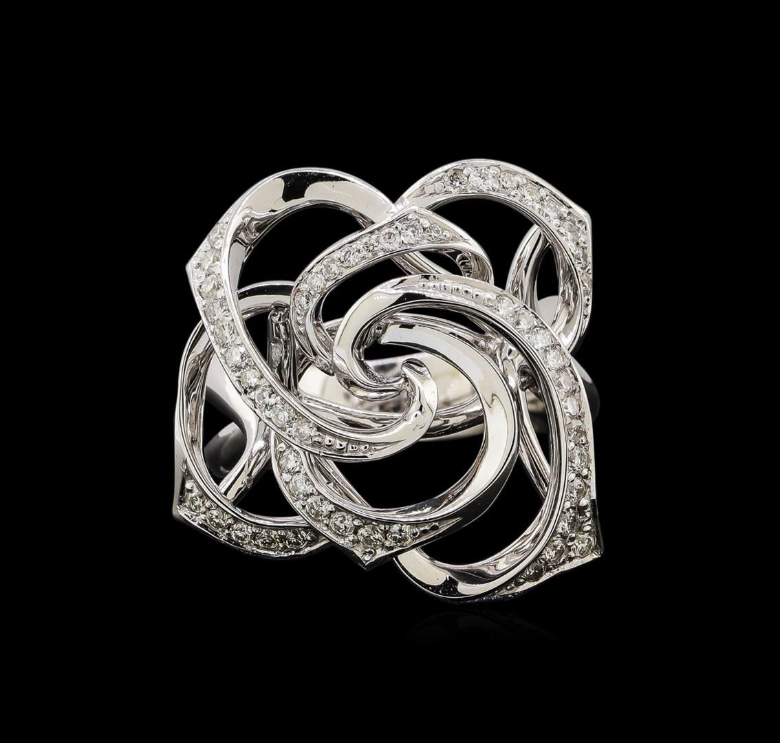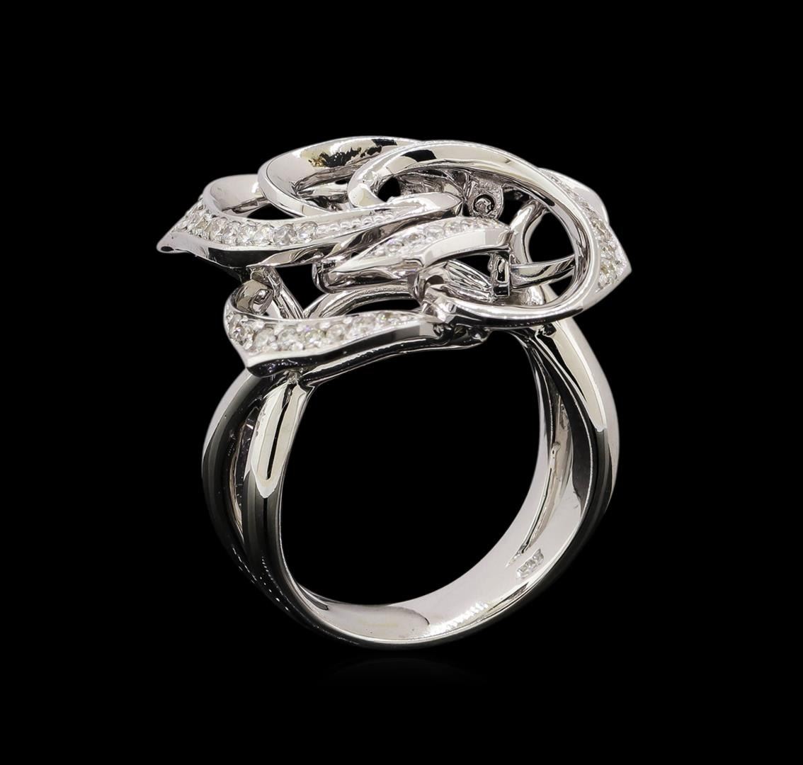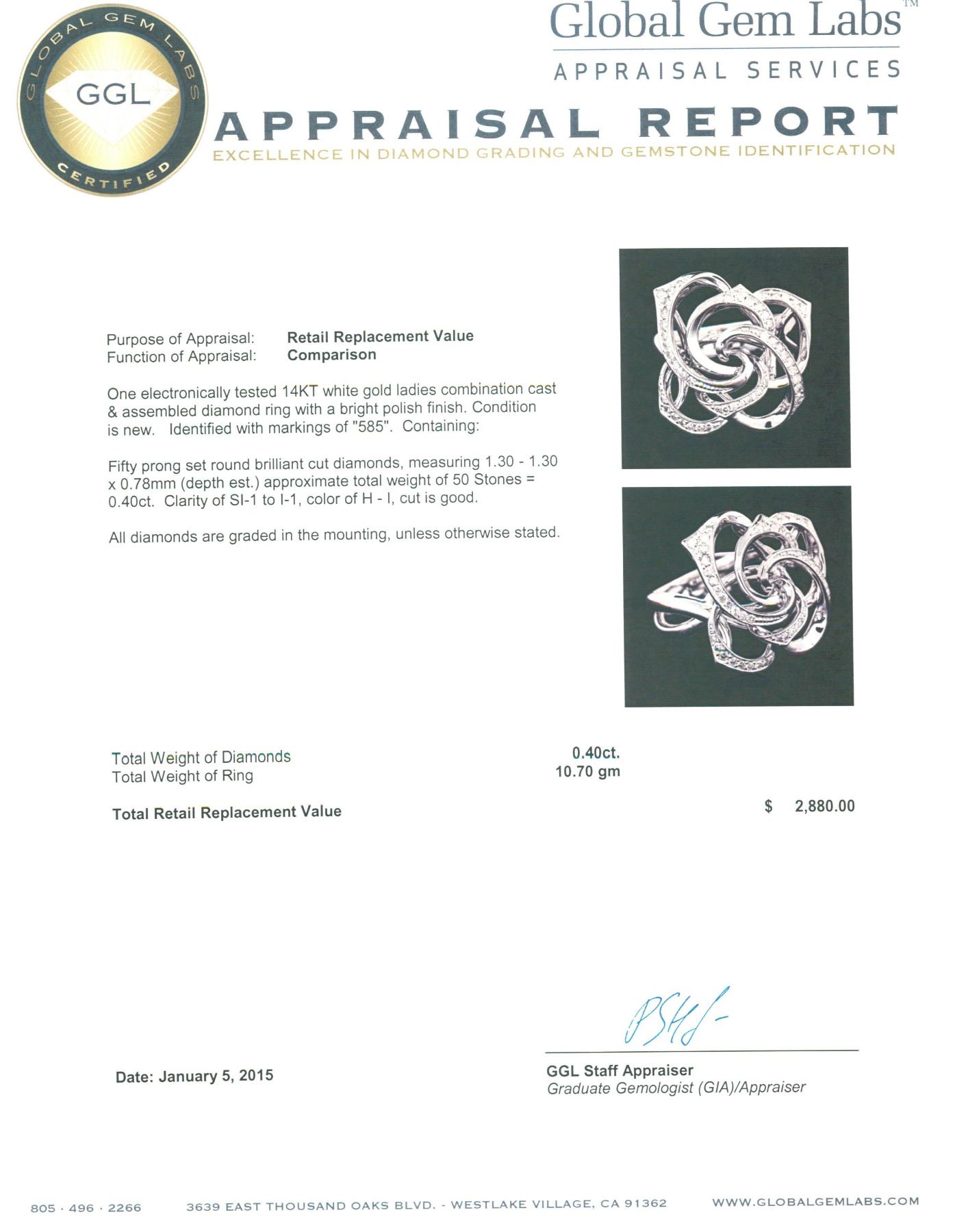 One electronically tested 14KT white gold ladies combination cast & assembled diamond ring with a bright polish finish. Identified with markings of "585". Condition is new. Containing: Fifty prong set round brilliant cut diamonds, measuring 1.30 - 1.30 x 0.78mm (depth est.) approximate total weight of 50 Stones = 0.40ct. Clarity: SI-1 to I-1. Color: H - I, Cut is Good. All diamonds are graded in the mounting, unless otherwise stated. Total Weight of Diamonds 0.40ct. Total Weight of Ring 10.70 grams. GGL Appraised.