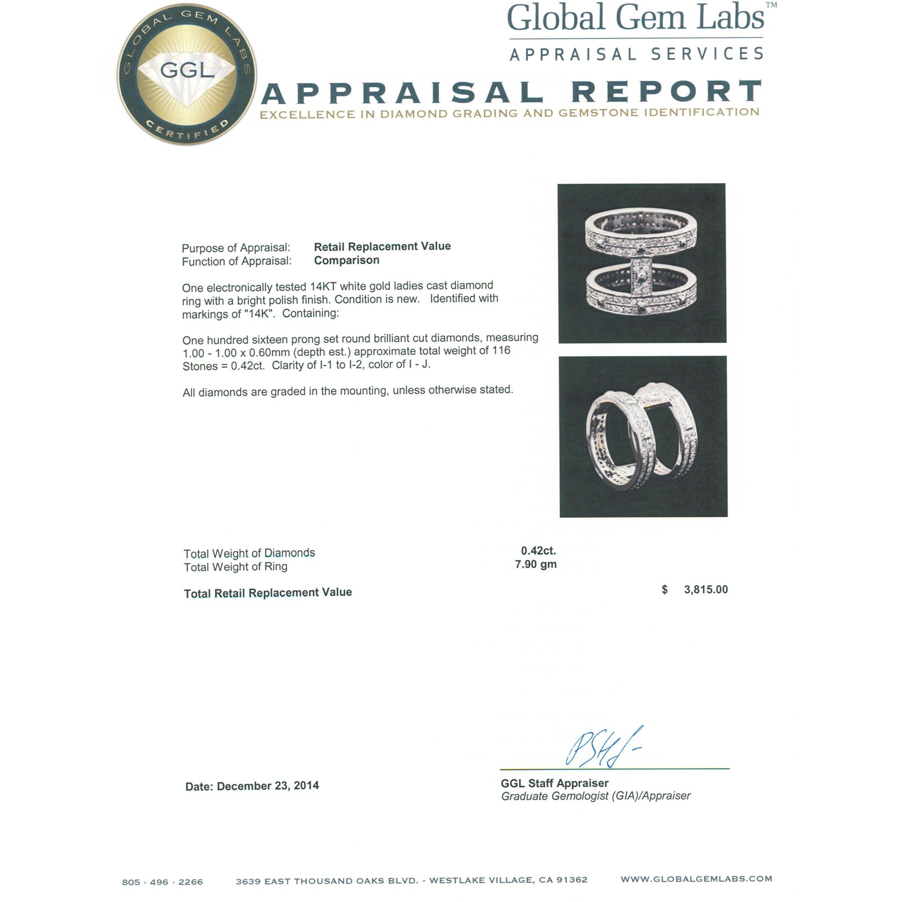 One electronically tested 14KT white gold ladies cast diamond ring with a bright polish finish. Identified with markings of "14K". Condition is new. Containing: One Hundred Sixteen prong set round brilliant cut diamonds, measuring 1.00 - 1.00 x 0.60mm (depth est.) approximate total weight of 116 Stones = 0.42ct. Clarity: I-1 to I-2. Color: I - J. All diamonds are graded in the mounting, unless otherwise stated. Total Weight of Diamonds 0.42ct. Total Weight of Ring 7.90 grams. GGL Appraised.