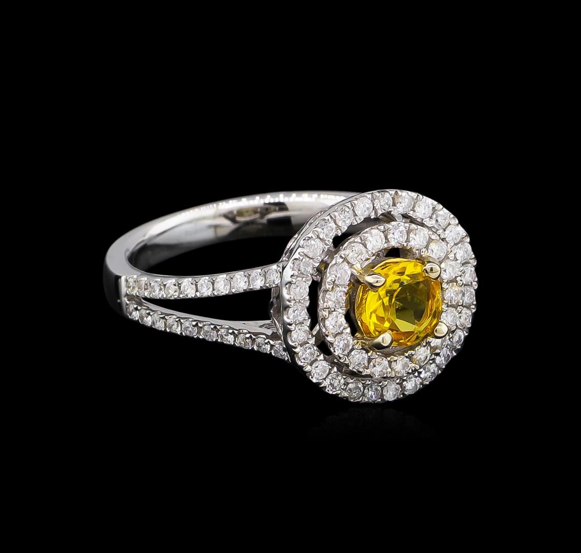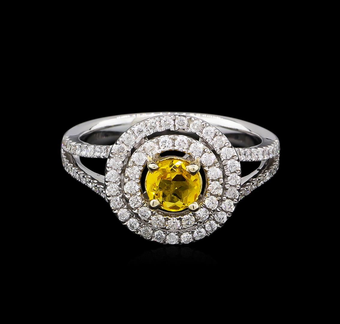 One electronically tested 14KT white gold Ladies combination cast & assembled ring with a bright polish finish. Condition is new. Identified with markings of "14K". Containing: Eighty-Six prong set round brilliant cut diamonds, measuring 1.10 - 1.10 x 1.10mm (depth est.) approximate. Total Weight of 86 Stones = 0.60ct. Clarity: I-1 to I-2. Color: J, Cut is Good. One prong set round modified brilliant cut natural citrine quartz, measuring 5.00 - 5.00 x 3.25 mm, exact weight 0.44ct., clarity is eye clean, medium light, brownish, orangy yellow color, (GIA oY 4/3), cut is very good. Colored gemstones are presumed to have been subjected to commonly used and possible undetectable color/clarity enhancement processes. Total Weight of Colored Stones 0.44ct. Total Weight of Diamonds 0.60ct. Total Weight of Ring 4.20 grams. GGL Appraised.