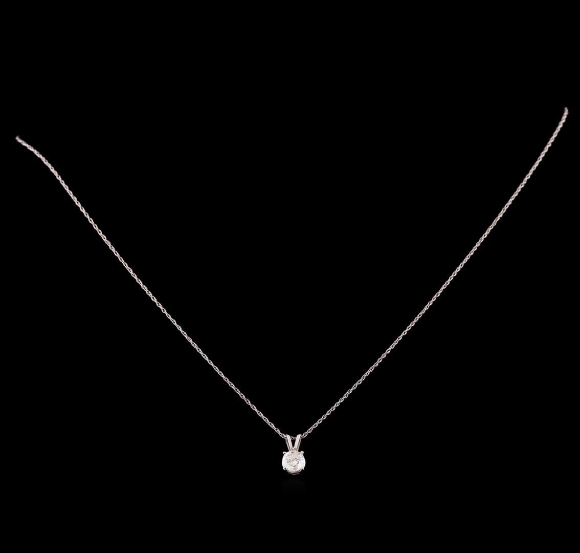 One electronically tested 14KT white gold ladies combination cast & die struck diamond pendant & chain 18.0" long, light cable link with a spring ring clasp with a bright polish finish. Identified with markings of "14K". Condition is new. Containing: One prong set round brilliant cut diamond, measuring 4.98 - 4.92 x 2.97mm (depth est.) approximate weight of 0.44ct. Clarity: I-2. Color: J, Cut is Good. All diamonds are graded in the mounting, unless otherwise stated. Total Weight of Diamonds 0.44ct. Total Weight of Pendant & Chain 1.10 grams. GGL Appraised at $4,090.00.
