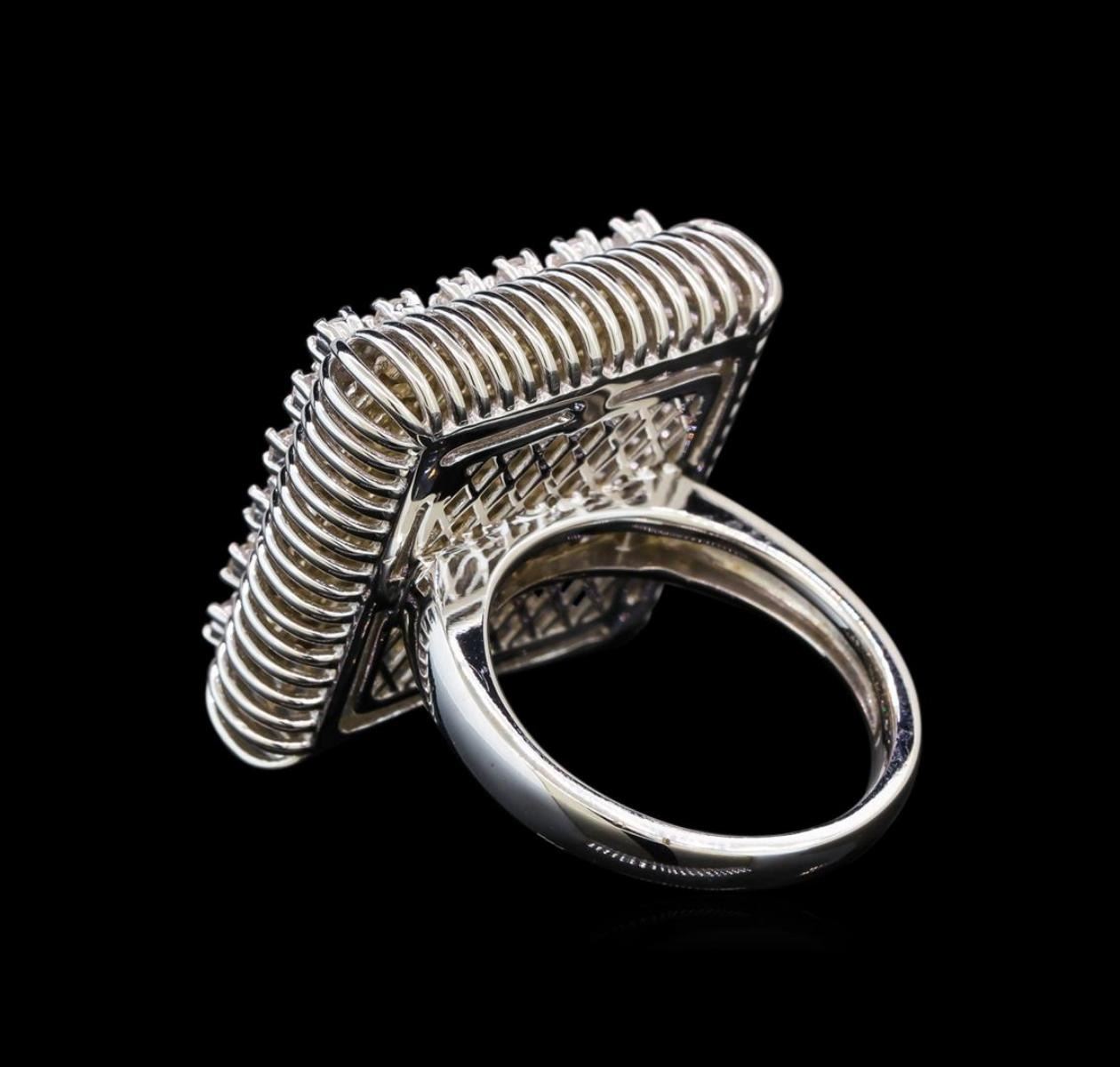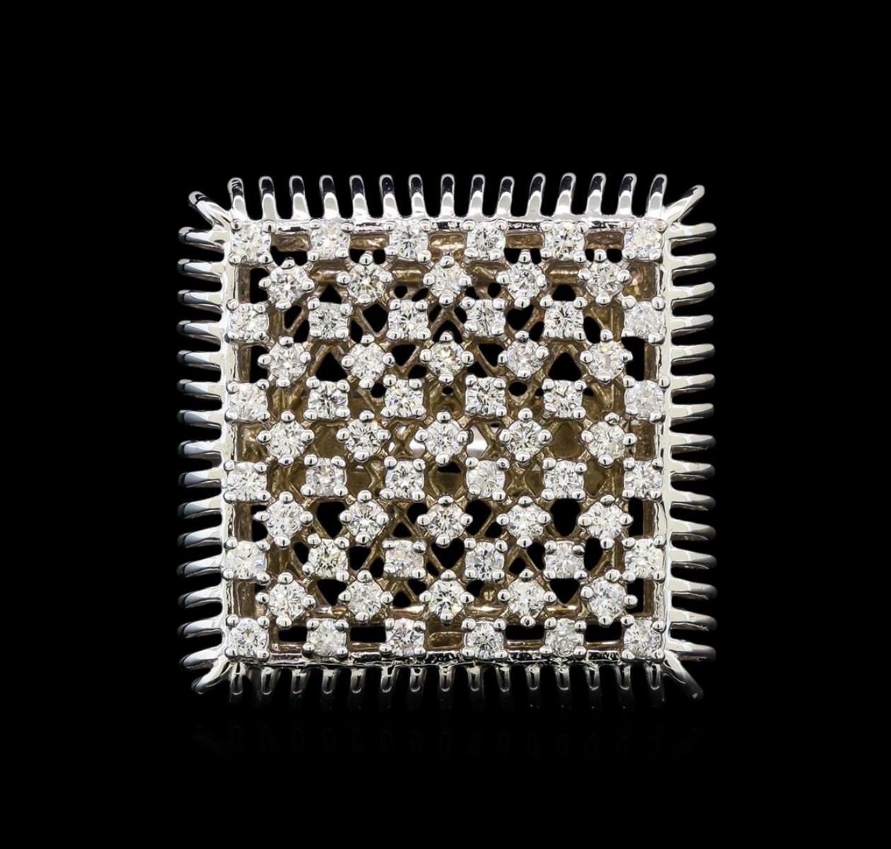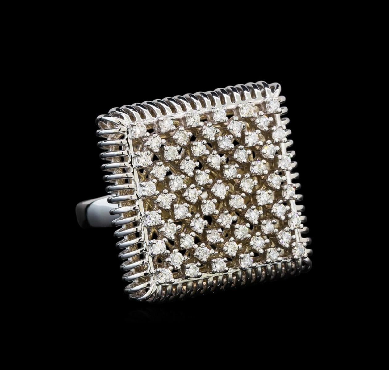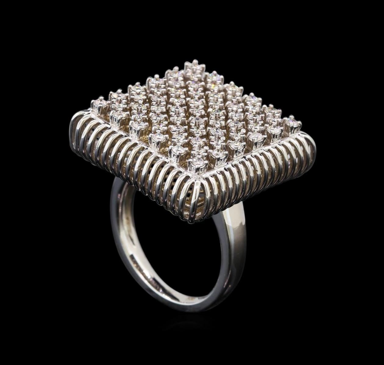 One electronically tested 14KT white gold ladies cast diamond ring with a bright polish finish. Identified with markings of "585". Condition is new. Containing: Sixty-One prong set round brilliant cut diamonds, measuring 1.30 - 1.30 x 0.78mm (depth est.) approximate total weight of 61 Stones = 0.49ct. Clarity: SI-2 to I-1. Color: I - J. All diamonds are graded in the mounting, unless otherwise stated. Total Weight of Diamonds 0.49ct. Total Weight of Ring 12.70 grams. GGL Appraised.