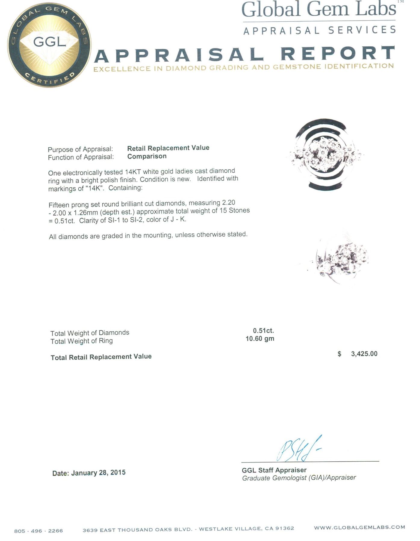One electronically tested 14KT white gold ladies cast diamond ring with a bright polish finish. Identified with markings of "14K". Condition is new. Containing: Fifteen prong set round brilliant cut diamonds, measuring 2.20 - 2.00 x 1.26mm (depth est.) approximate total weight of 15 Stones = 0.51ct. Clarity: SI-1 to SI-2. Color: J - K. All diamonds are graded in the mounting, unless otherwise stated. Total Weight of Diamonds 0.51ct. Total Weight of Ring 10.60 grams. GGL Appraised.
