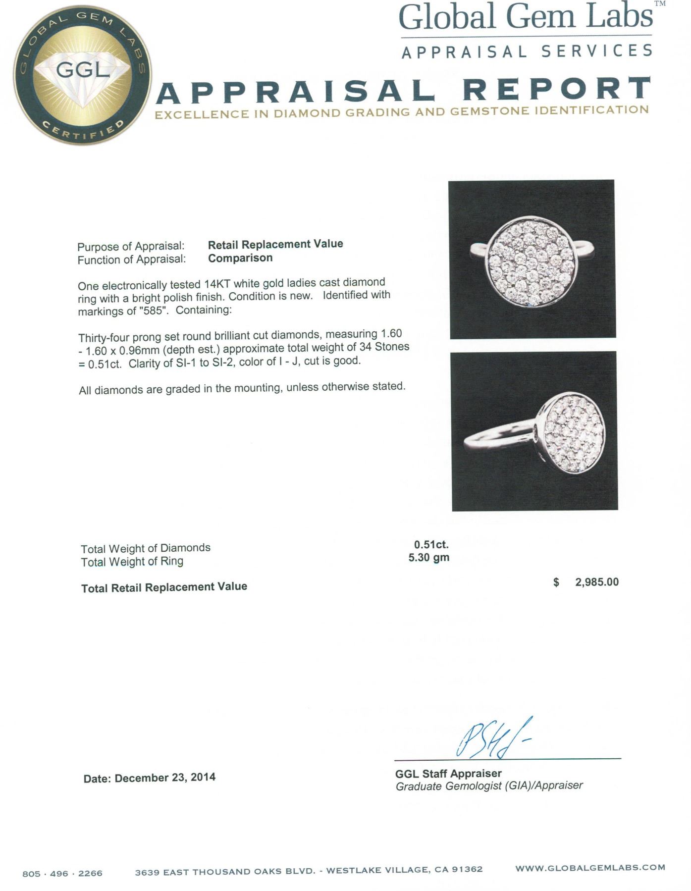 One electronically tested 14KT white gold ladies cast diamond ring with a bright polish finish. Identified with markings of "585". Condition is new. Containing: Thirty-Four prong set round brilliant cut diamonds, measuring 1.60 - 1.60 x 0.96mm (depth est.) approximate total weight of 34 Stones = 0.51ct. Clarity: SI-1 to SI-2. Color: I - J, Cut is Good. All diamonds are graded in the mounting, unless otherwise stated. Total Weight of Diamonds 0.51ct. Total Weight of Ring 5.30 grams. GGL Appraised.