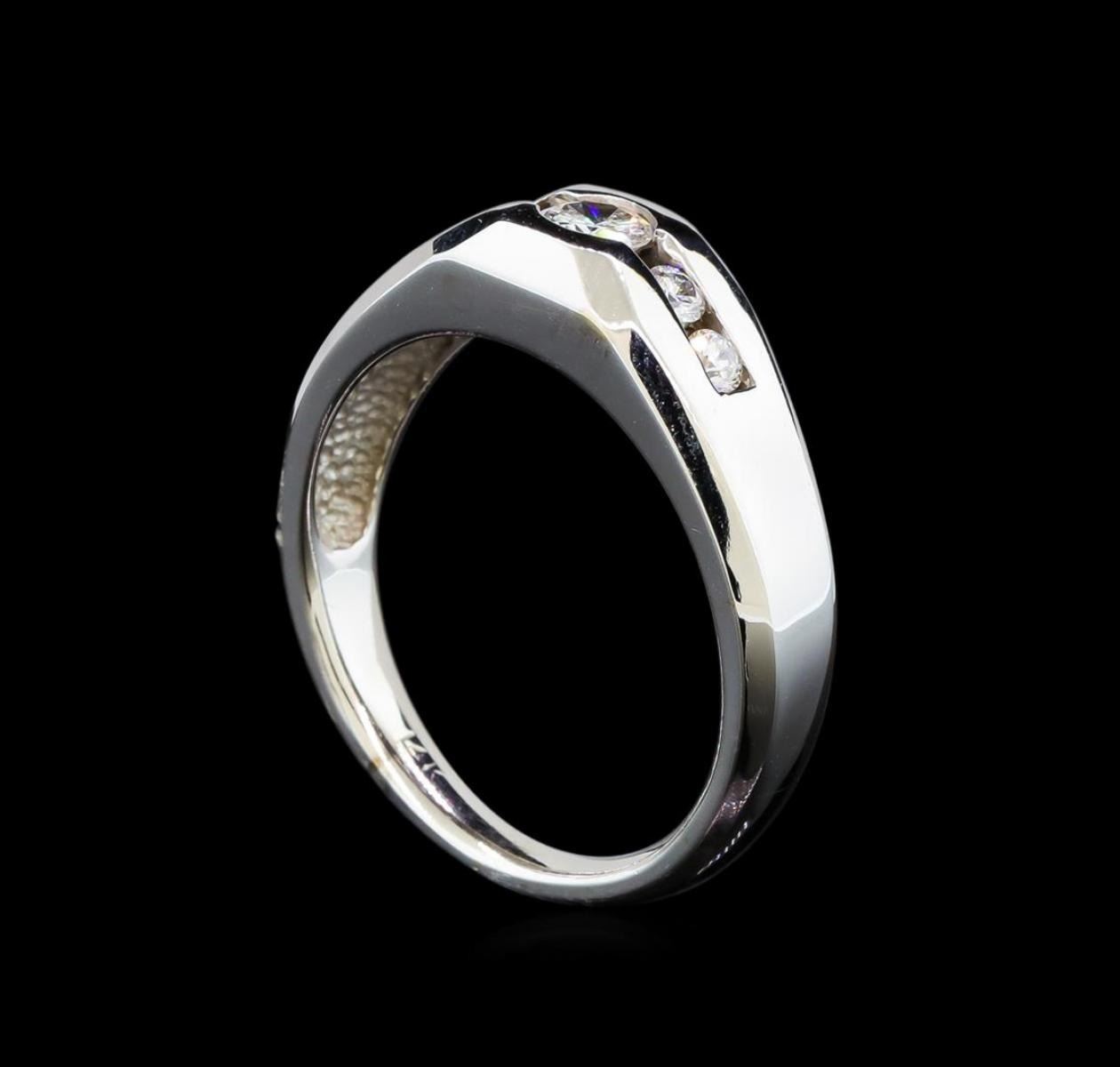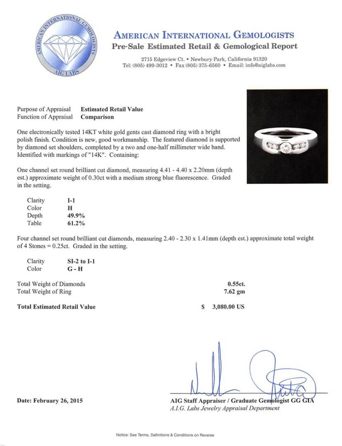One electronically tested 14KT white gold gents cast diamond ring with a bright polish finish. The featured diamond is supported by diamond set shoulders, completed by a two and one-half millimeter wide band. Identified with markings of "14K". Condition is new, good workmanship. Containing: One channel set round brilliant cut diamond, measuring 4.41 - 4.40 x 2.20mm (depth est.) approximate weight of 0.30ct with a medium strong blue fluorescence. Graded in the setting. Clarity: I-1. Color: H. Depth 49.9%. Table 61.2%. Four channel set round brilliant cut diamonds, measuring 2.40 - 2.30 x 1.41mm (depth est.) approximate total weight of 4 Stones = 0.25ct. Graded in the setting. Clarity: SI-2 to I-1. Color: G - H. Total Weight of Diamonds 0.55ct. Total Weight of Ring 7.62 grams. AIG Appraised.