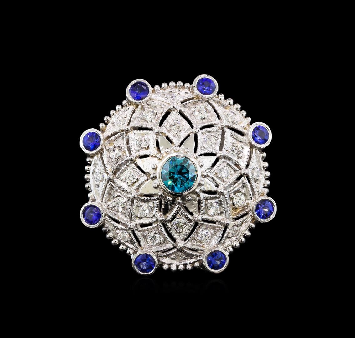 One electronically tested 14KT white gold ladies cast tanzanite and diamond ring with a bright polish finish. Identified with markings of "K14". Condition is new. Containing: Eight bezel set round modified brilliant cut natural tanzanites, measuring 2.50 - 2.50 x 1.63 mm, approximate total weight of 0.56ct., clarity is slightly included, type I, medium light, very slightly grayish, violet color, (GIA V 4/3), cut is good. One bezel set round brilliant cut diamond, measuring 5.00 - 5.00 x 3.00mm (depth est.) approximate weight of 0.46ct. Clarity: I-2, Cut is Good. Color of the stone has been treated. Twenty-Four prong set round brilliant cut diamonds, measuring 1.80 - 1.80 x 1.08mm (depth est.) approximate total weight of 24 Stones = 0.51ct. Clarity: SI-1 to SI-2. Color: G - H, Cut is Good. Colored gemstones are presumed to have been subjected to commonly used enhancement processes. All diamonds and colored gemstones are graded in the mounting, unless otherwise stated. Total Weight of Colored Stones 0.56ct. Total Weight of Diamonds 0.97ct. Total Weight of Ring 9.30 grams. GGL Appraised.