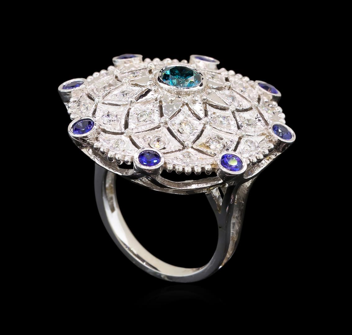One electronically tested 14KT white gold ladies cast tanzanite and diamond ring with a bright polish finish. Identified with markings of "K14". Condition is new. Containing: Eight bezel set round modified brilliant cut natural tanzanites, measuring 2.50 - 2.50 x 1.63 mm, approximate total weight of 0.56ct., clarity is slightly included, type I, medium light, very slightly grayish, violet color, (GIA V 4/3), cut is good. One bezel set round brilliant cut diamond, measuring 5.00 - 5.00 x 3.00mm (depth est.) approximate weight of 0.46ct. Clarity: I-2, Cut is Good. Color of the stone has been treated. Twenty-Four prong set round brilliant cut diamonds, measuring 1.80 - 1.80 x 1.08mm (depth est.) approximate total weight of 24 Stones = 0.51ct. Clarity: SI-1 to SI-2. Color: G - H, Cut is Good. Colored gemstones are presumed to have been subjected to commonly used enhancement processes. All diamonds and colored gemstones are graded in the mounting, unless otherwise stated. Total Weight of Colored Stones 0.56ct. Total Weight of Diamonds 0.97ct. Total Weight of Ring 9.30 grams. GGL Appraised.