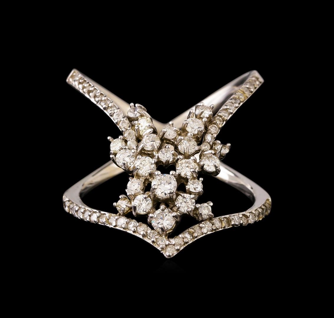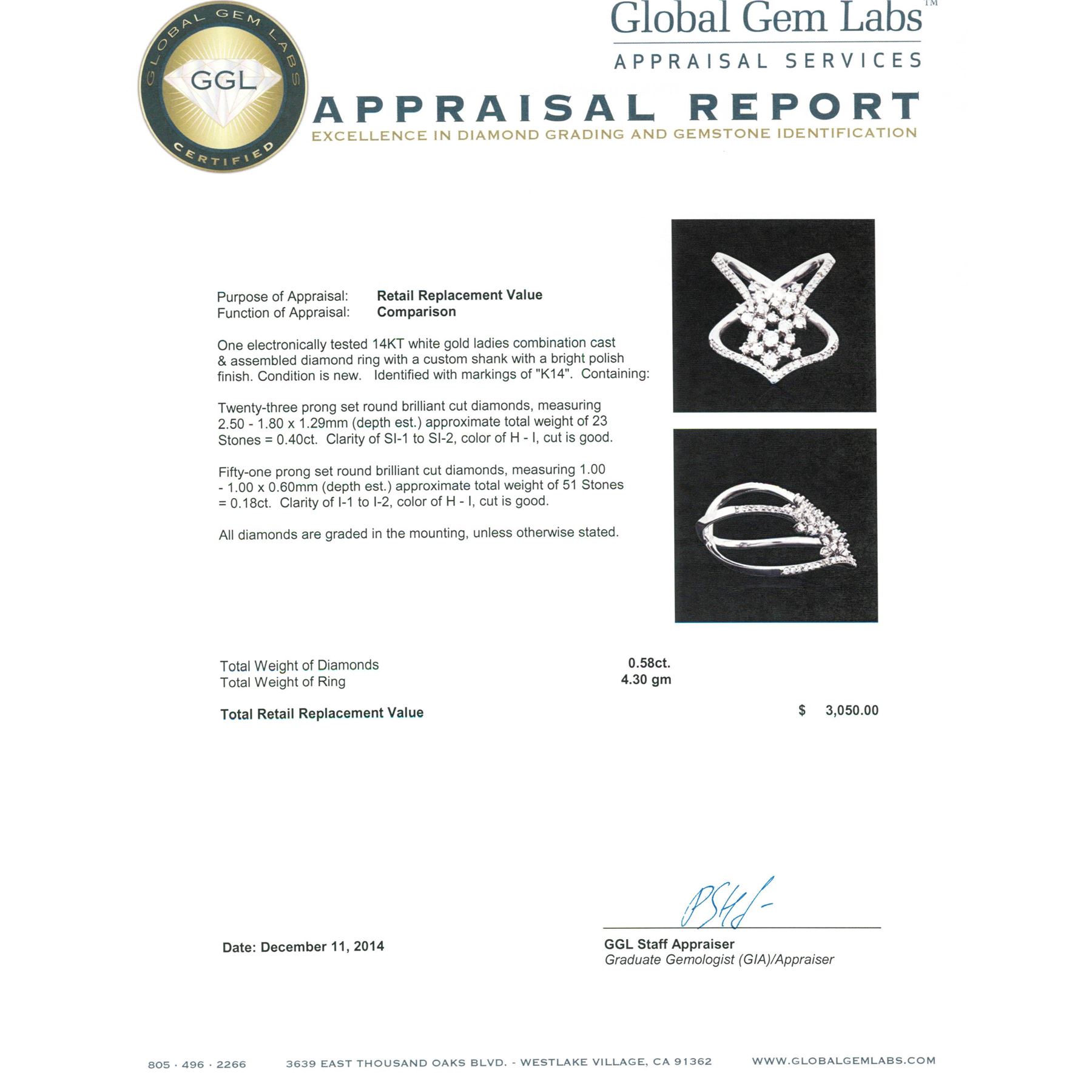 One electronically tested 14KT white gold ladies combination cast & assembled diamond ring with a custom shank with a bright polish finish. Identified with markings of "K14". Condition is new. Containing: Twenty-Three prong set round brilliant cut diamonds, measuring 2.50 - 1.80 x 1.29mm (depth est.) approximate total weight of 23 Stones = 0.40 ct. Clarity: SI-1 to SI-2. Color: H - I, Cut is Good. Fifty-One prong set round brilliant cut diamonds, measuring 1.00 - 1.00 x 0.60mm (depth est.) approximate total weight of 51 Stones = 0.18ct. Clarity: I-1 to I-2. Color: H - I, Cut is Good. All diamonds are graded in the mounting, unless otherwise stated. Total Weight of Diamonds 0.58ct. Total Weight of Ring 4.30 grams. GGL Appraised.