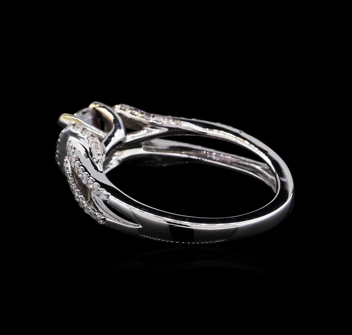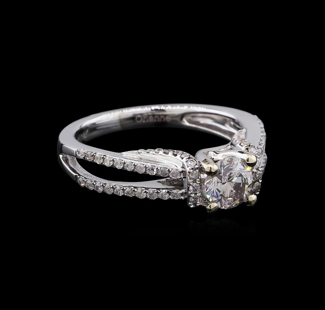 One electronically tested 14KT white gold Ladies combination cast & assembled engagement ring with a bright polish finish. Condition is new. Identified with markings of "14K". Containing: One prong set round brilliant cut diamond, measuring 5.50 - 5.50 x 3.30mm (depth est.) approximate weight of 0.61ct. Clarity: I-1. Color: G, Cut is Good. Seventy-Six prong set round brilliant cut diamonds, measuring 1.00 - 1.00 x 0.60mm (depth est.) approximate. Total Weight of 76 Stones = 0.27ct. Clarity: I-2 to I-3. Color: G - H, Cut is Fair. Total Weight of Diamonds 0.88ct. Total Weight of Ring 4.40 grams. GGL Appraised.
