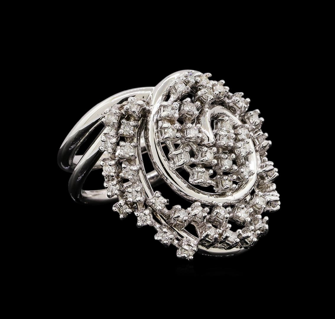 One electronically tested 14KT white gold ladies cast diamond ring with a bright polish finish. Identified with markings of "K14". Condition is new. Containing: Fifty prong set round brilliant cut diamonds, measuring 1.50 - 1.50 x 0.90mm (depth est.) approximate total weight of 50 Stones = 0.62ct. Clarity: SI-2 to I-1. Color: J - K, Cut is Good. All diamonds are graded in the mounting, unless otherwise stated. Total Weight of Diamonds 0.62ct. Total Weight of Ring 12.30 grams. GGL Appraised.
