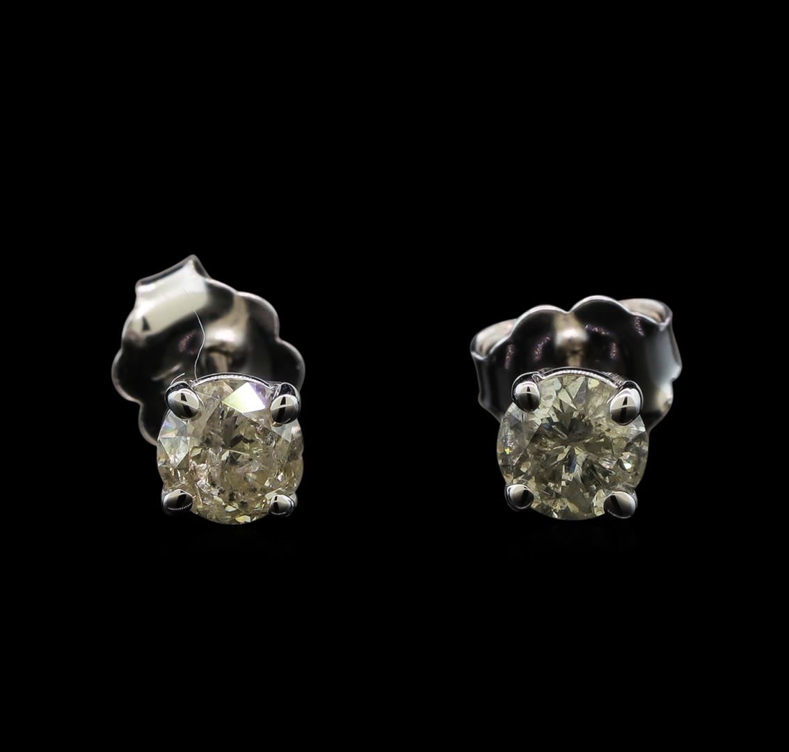 One pair electronically tested 14KT white gold ladies cast diamond stud earrings with friction posts with a bright polish finish. Identified with markings of "14K". Condition is new. Containing: Two prong set round brilliant cut diamonds, measuring 4.38 - 4.38 x 2.64mm (depth est.) approximate total weight of 2 Stones = 0.62ct. Clarity: I-3 to I-3. Color: K, Cut is Good. Diamonds are graded in the mounting, unless otherwise stated. Total Weight of Diamonds 0.62ct. Total Weight of Stud Earrings 0.70 grams. GGL Appraised at $740.00.