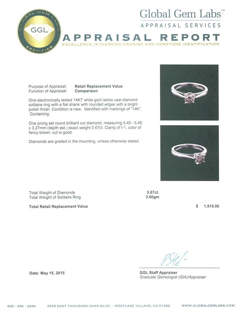 One electronically tested 14KT white gold ladies cast diamond solitaire ring with a flat shank with rounded edges with a bright polish finish. Identified with markings of "14K". Condition is new. Containing: One prong set round brilliant cut diamond, measuring 5.45 - 5.45 x 3.27mm (depth est.) exact weight 0.67ct. Clarity: I-1, Cut is Good. Diamonds are graded in the mounting, unless otherwise stated. Total Weight of Diamonds 0.67ct. Total Weight of Solitaire Ring 3.60 grams. GGL Appraised.