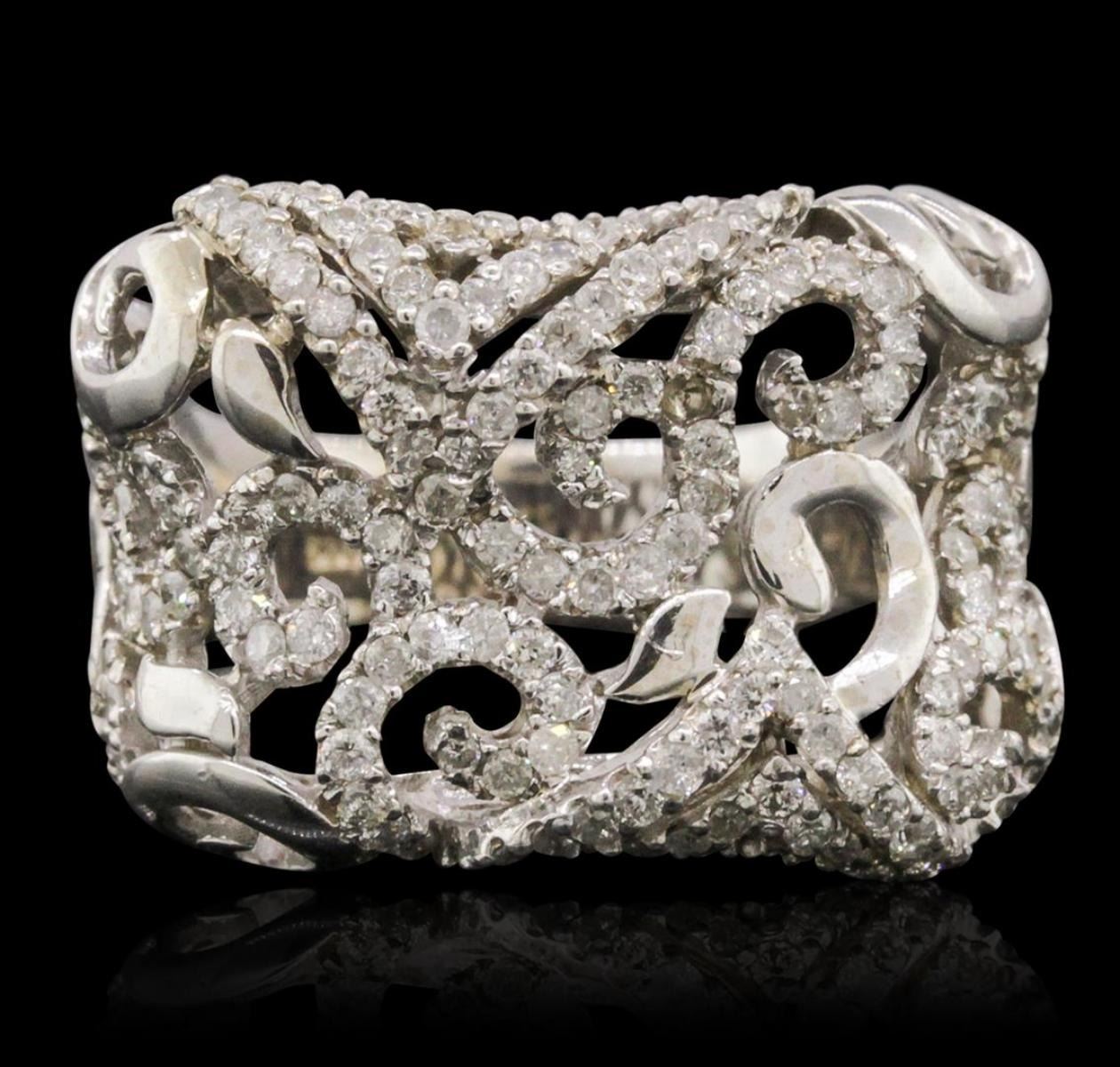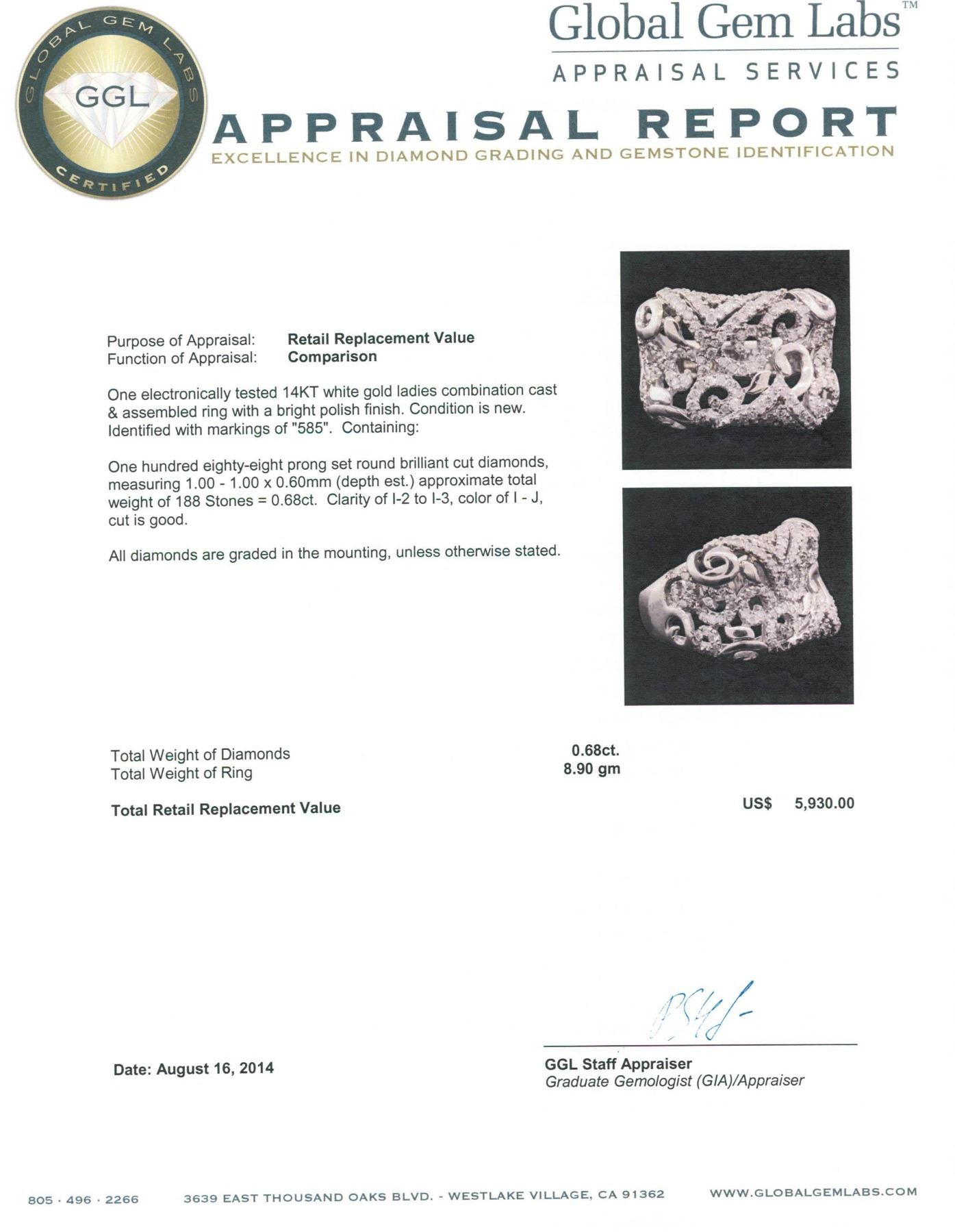 One electronically tested 14KT white gold ladies combination cast & assembled ring with a bright polish finish. Condition is new. Identified with markings of "585". Containing: One Hundred Eighty-Eight prong set round brilliant cut diamonds, measuring 1.00 - 1.00 x 0.60mm (depth est.) approximate. Total Weight of 188 Stones = 0.68ct. Clarity: I-2 to I-3. Color: I - J, Cut is Good. All diamonds are graded in the mounting, unless otherwise stated. Total Weight of Diamonds 0.68ct. Total Weight of Ring 8.90 grams. GGL Appraised.