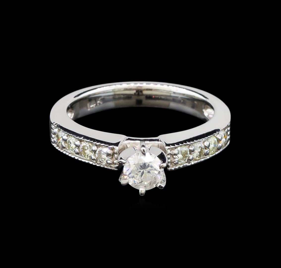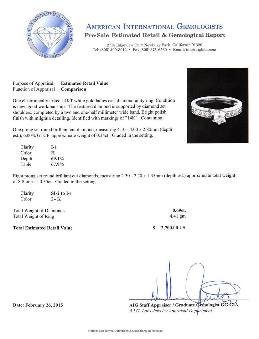One electronically tested 14KT white gold ladies cast diamond unity ring. The featured diamond is supported by diamond set shoulders, completed by a two and one-half millimeter wide band. Bright polish finish with milgrain detailing. Identified with markings of "14K". Condition is new, good workmanship. Containing: One prong set round brilliant cut diamond, measuring 4.10 - 4.00 x 2.80mm (depth est.), 6.00.% GTCF approximate weight of 0.34ct. Graded in the setting. Clarity: I-1. Color: H. Depth 69.1%. Table 67.9%. Eight prong set round brilliant cut diamonds, measuring 2.30 - 2.20 x 1.35mm (depth est.) approximate total weight of 8 Stones = 0.35ct. Graded in the setting. Clarity: SI-2 to I-1. Color: I - K. Total Weight of Diamonds 0.69ct. Total Weight of Ring 4.41 grams. AIG Appraised.