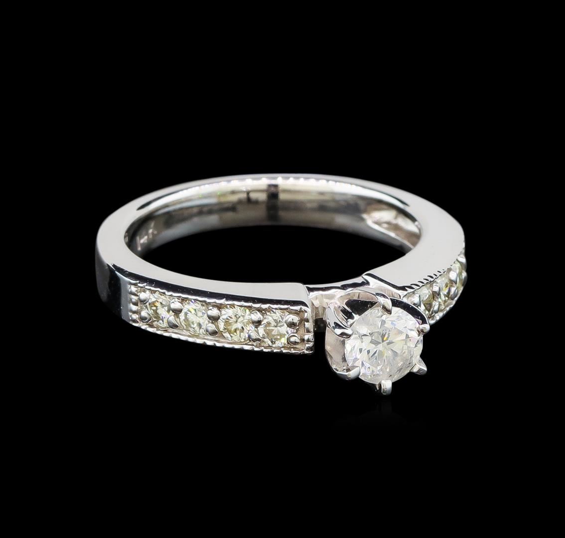 One electronically tested 14KT white gold ladies cast diamond unity ring. The featured diamond is supported by diamond set shoulders, completed by a two and one-half millimeter wide band. Bright polish finish with milgrain detailing. Identified with markings of "14K". Condition is new, good workmanship. Containing: One prong set round brilliant cut diamond, measuring 4.10 - 4.00 x 2.80mm (depth est.), 6.00.% GTCF approximate weight of 0.34ct. Graded in the setting. Clarity: I-1. Color: H. Depth 69.1%. Table 67.9%. Eight prong set round brilliant cut diamonds, measuring 2.30 - 2.20 x 1.35mm (depth est.) approximate total weight of 8 Stones = 0.35ct. Graded in the setting. Clarity: SI-2 to I-1. Color: I - K. Total Weight of Diamonds 0.69ct. Total Weight of Ring 4.41 grams. AIG Appraised.