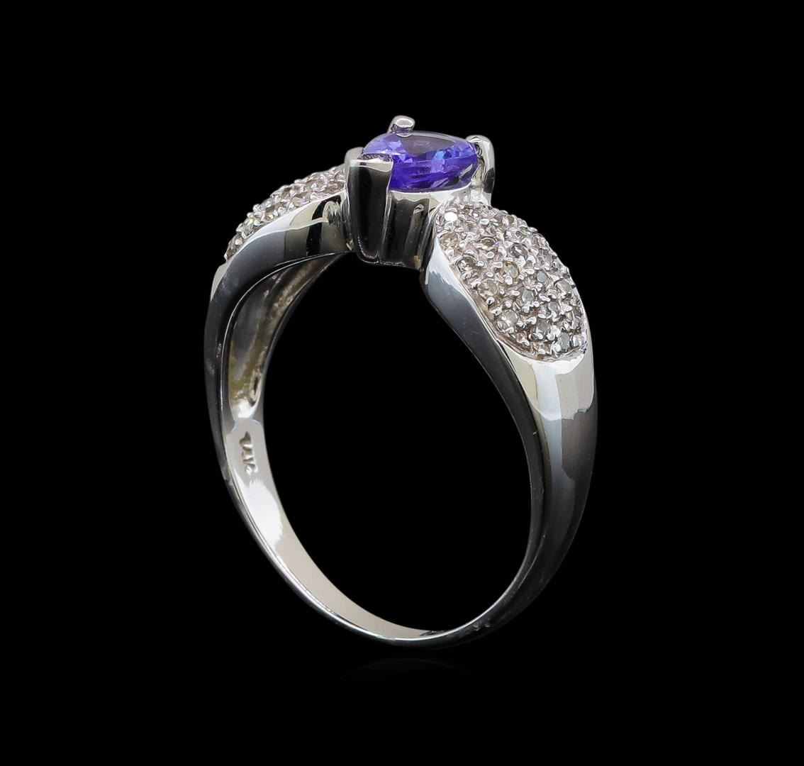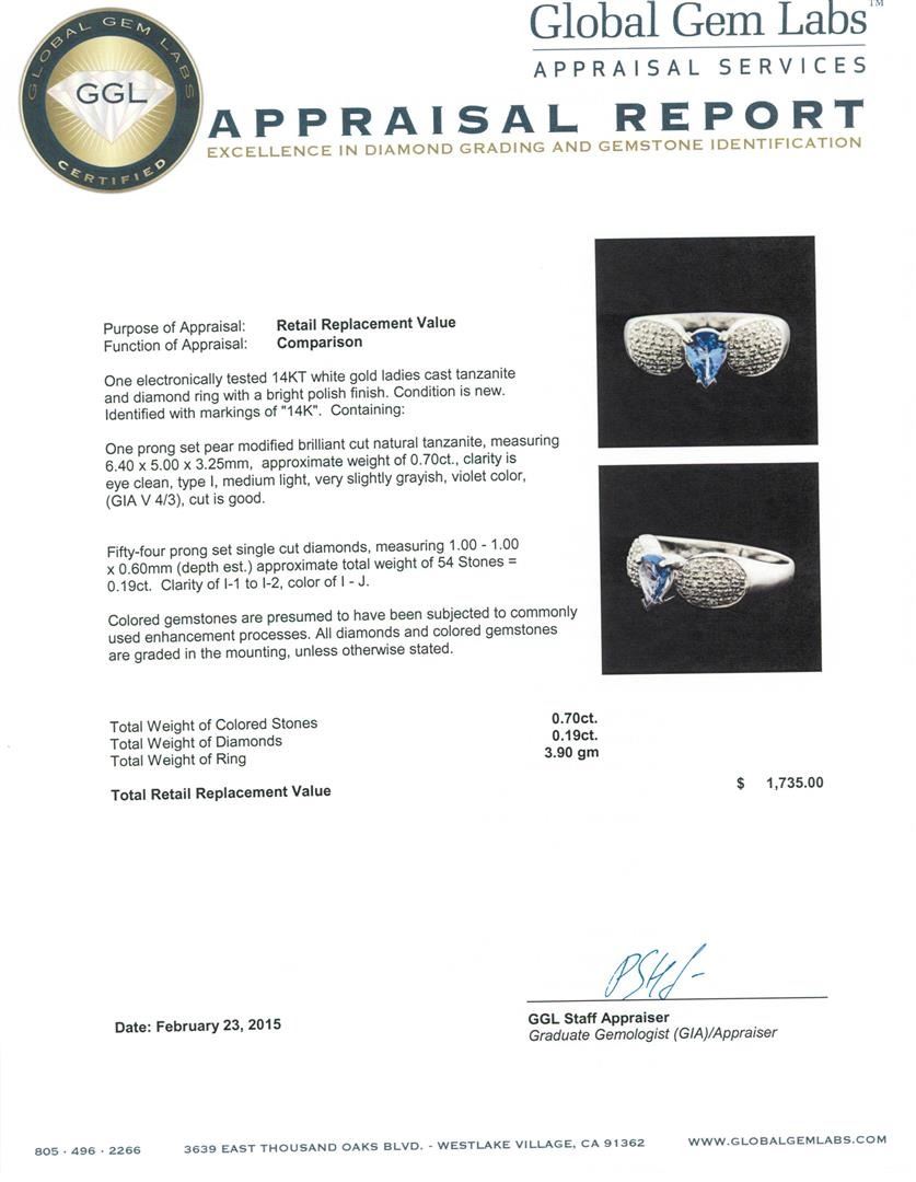 One electronically tested 14KT white gold ladies cast tanzanite and diamond ring with a bright polish finish. Identified with markings of "14K". Condition is new. Containing: One prong set pear modified brilliant cut natural tanzanite, measuring 6.40 x 5.00 x 3.25mm, approximate weight of 0.70 ct., clarity is eye clean, type I, medium light, very slightly grayish, violet color, (GIA V 4/3), cut is good. Fifty-Four prong set single cut diamonds, measuring 1.00 - 1.00 x 0.60mm (depth est.) approximate total weight of 54 Stones = 0.19ct. Clarity: I-1 to I-2. Color: I - J. Colored gemstones are presumed to have been subjected to commonly used enhancement processes. All diamonds and colored gemstones are graded in the mounting, unless otherwise stated. Total Weight of Colored Stones 0.70 ct. Total Weight of Diamonds 0.19ct. Total Weight of Ring 3.90 grams. GGL Appraised.