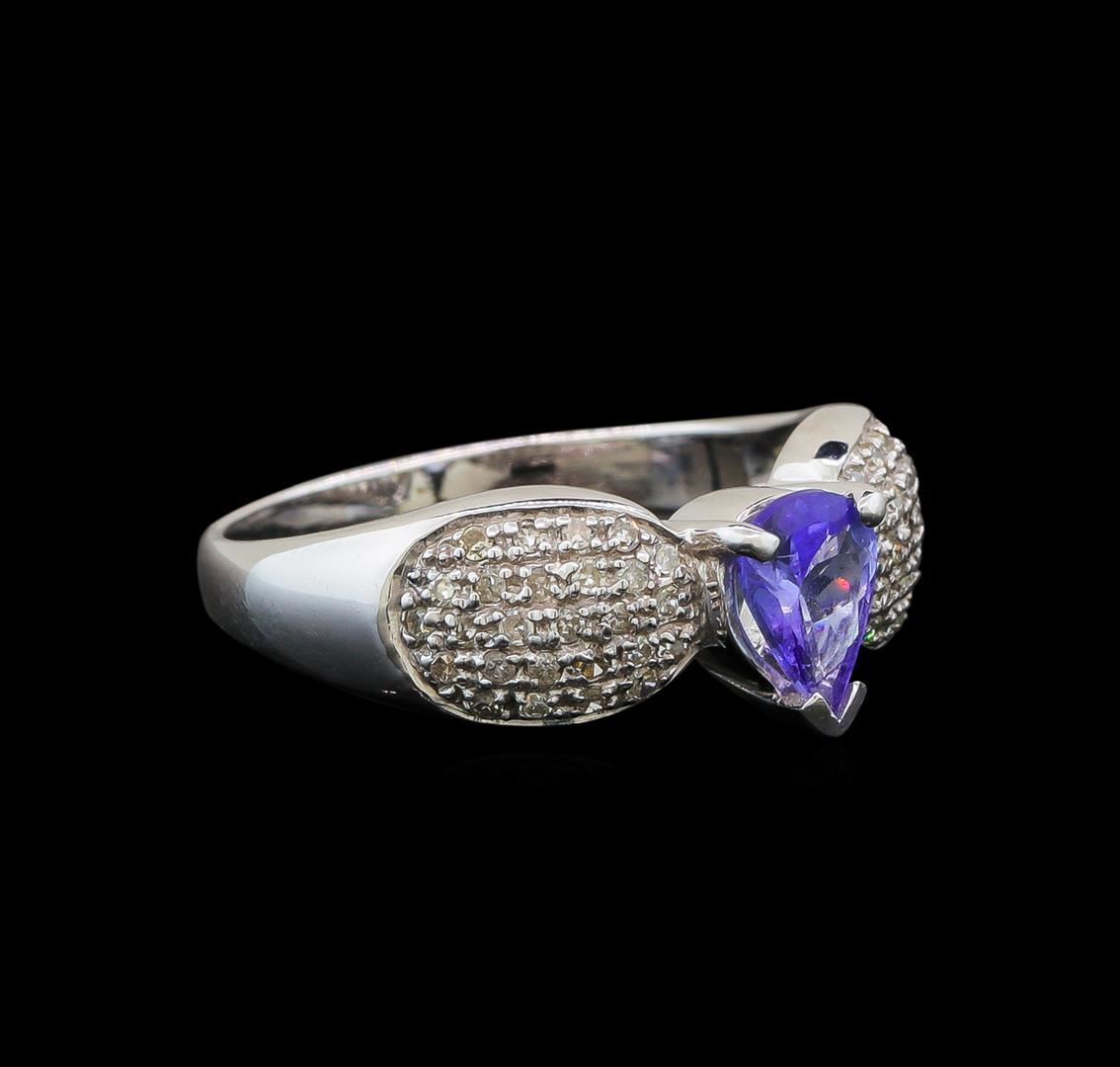 One electronically tested 14KT white gold ladies cast tanzanite and diamond ring with a bright polish finish. Identified with markings of "14K". Condition is new. Containing: One prong set pear modified brilliant cut natural tanzanite, measuring 6.40 x 5.00 x 3.25mm, approximate weight of 0.70 ct., clarity is eye clean, type I, medium light, very slightly grayish, violet color, (GIA V 4/3), cut is good. Fifty-Four prong set single cut diamonds, measuring 1.00 - 1.00 x 0.60mm (depth est.) approximate total weight of 54 Stones = 0.19ct. Clarity: I-1 to I-2. Color: I - J. Colored gemstones are presumed to have been subjected to commonly used enhancement processes. All diamonds and colored gemstones are graded in the mounting, unless otherwise stated. Total Weight of Colored Stones 0.70 ct. Total Weight of Diamonds 0.19ct. Total Weight of Ring 3.90 grams. GGL Appraised.