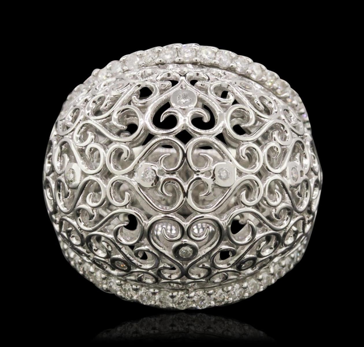 One electronically tested 14KT white gold ladies cast diamond ring with a bright polish finish. Condition is new, good workmanship. The ring features a lattice curvature with diamond accents set within mirroring diamond ribbons, completed by a five and one-half millimeter wide band. Identified with markings of "14K". Containing: Sixty-Eight prong and bezel set round brilliant cut diamonds, measuring 1.50 - 1.20 x 0.81mm (depth est.) approximate. Total Weight of 68 Stones = 0.71ct. Graded in the setting. Clarity: I-1 to I-2. Color: G - I. Total Weight of Diamonds 0.71ct. Total Weight of Ring 11.57gm. AIG Appraised.