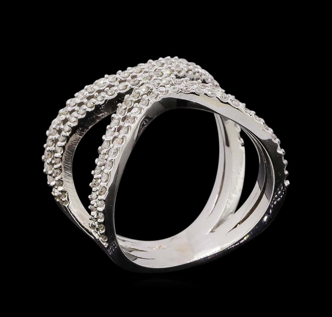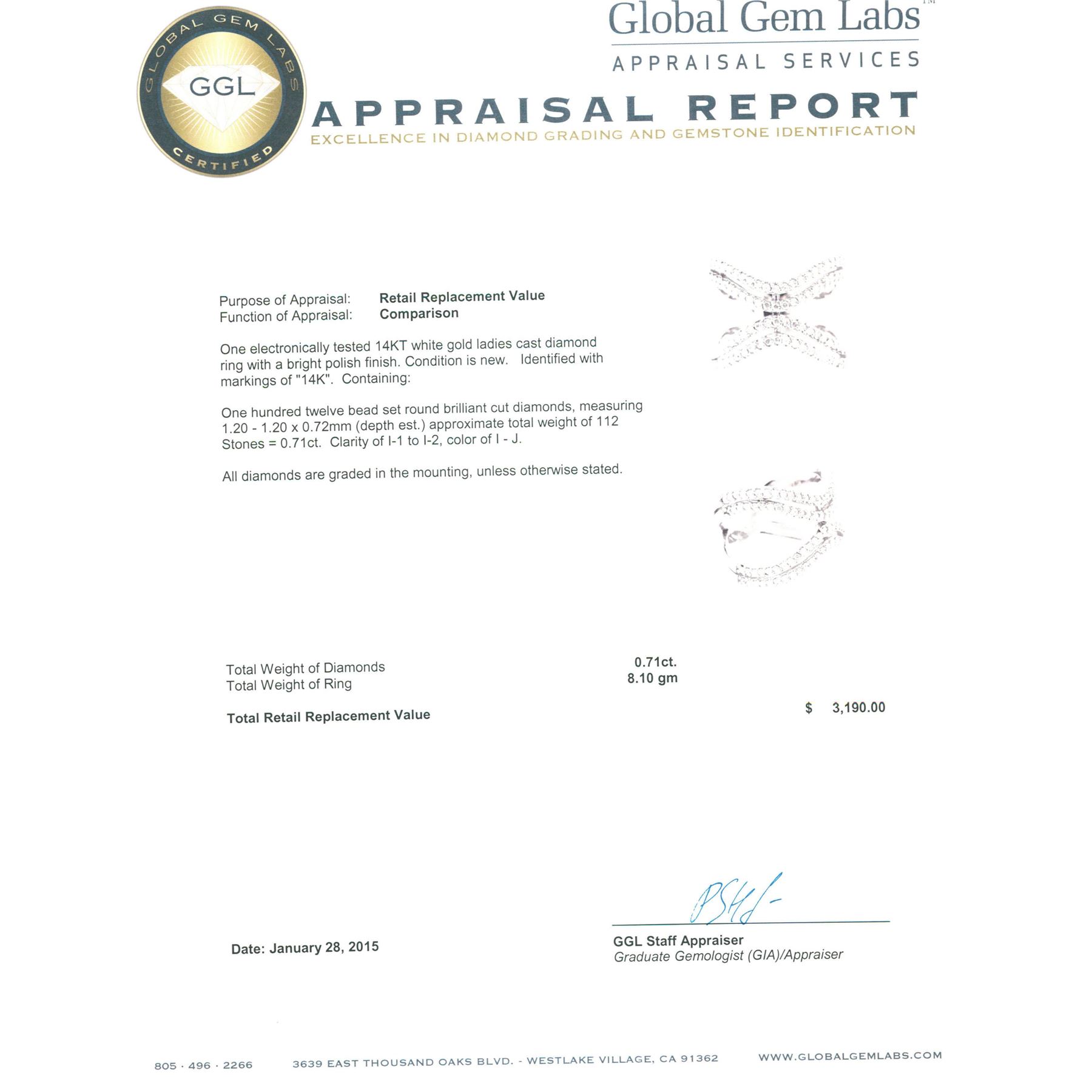 One electronically tested 14KT white gold ladies cast diamond ring with a bright polish finish. Identified with markings of "14K". Condition is new. Containing: One Hundred Twelve bead set round brilliant cut diamonds, measuring 1.20 - 1.20 x 0.72mm (depth est.) approximate total weight of 112 Stones = 0.71ct. Clarity: I-1 to I-2. Color: I - J. All diamonds are graded in the mounting, unless otherwise stated. Total Weight of Diamonds 0.71ct. Total Weight of Ring 8.10 grams. GGL Appraised.