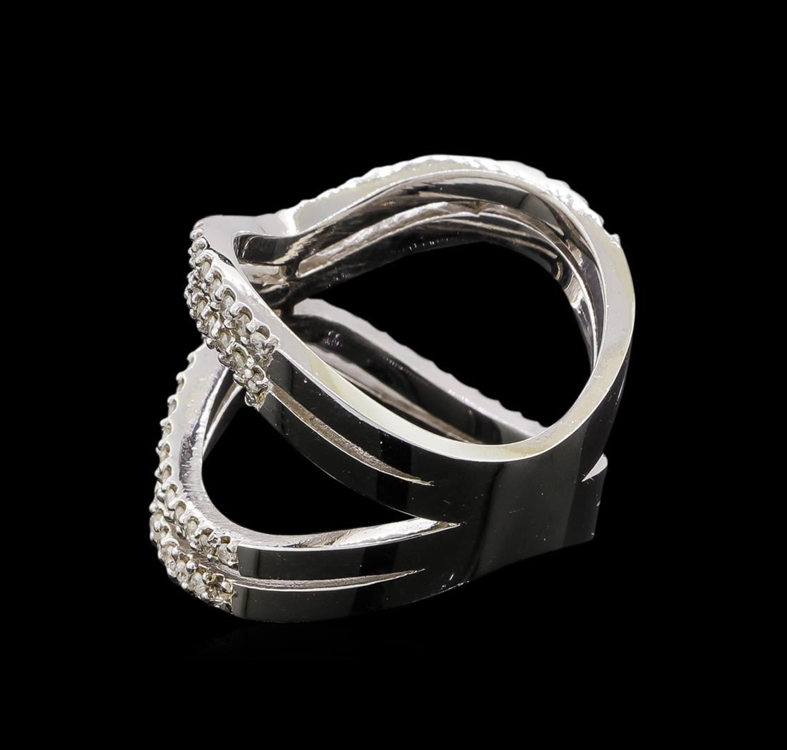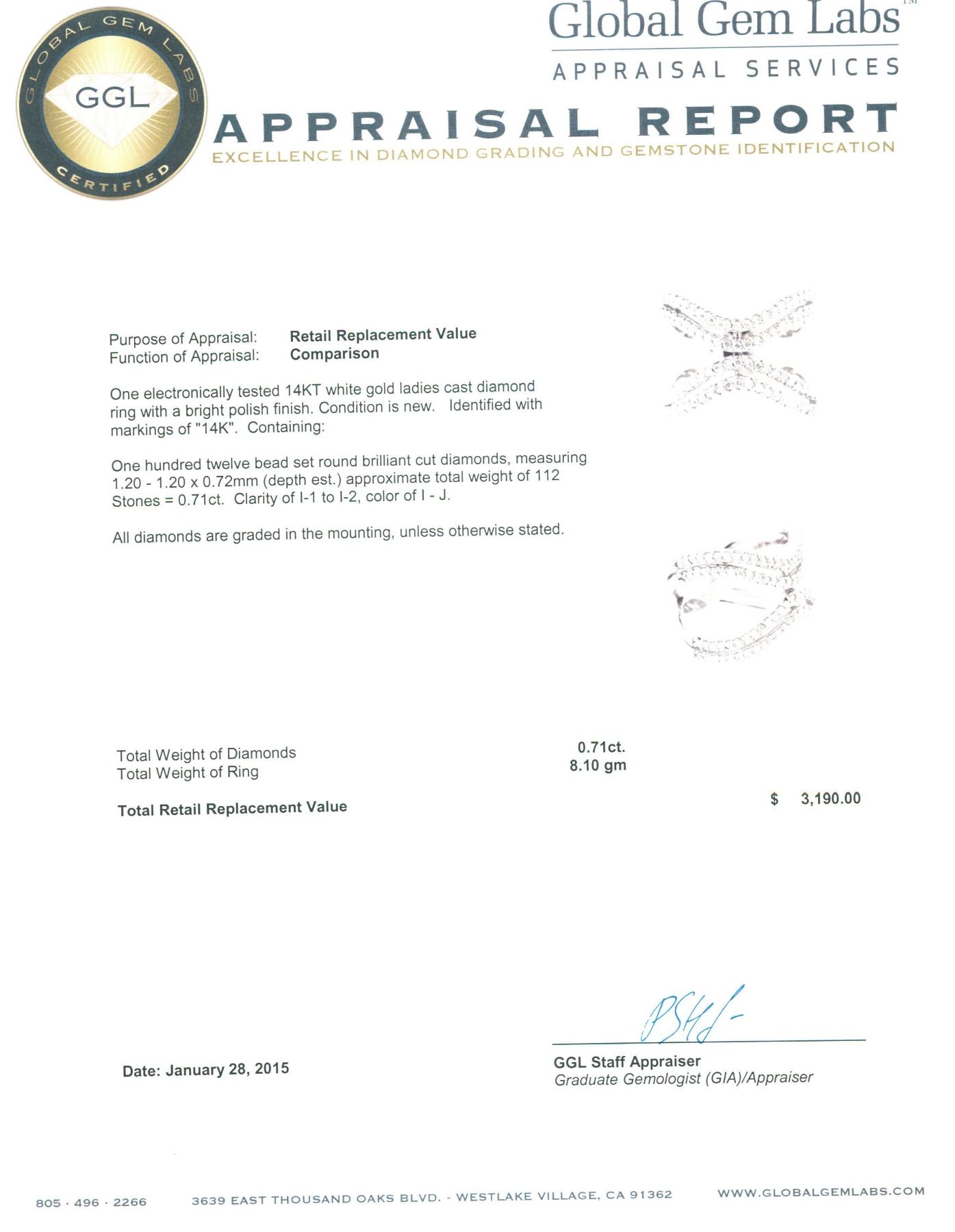 One electronically tested 14KT white gold ladies cast diamond ring with a bright polish finish. Identified with markings of "14K". Condition is new. Containing: One Hundred Twelve bead set round brilliant cut diamonds, measuring 1.20 - 1.20 x 0.72mm (depth est.) approximate total weight of 112 Stones = 0.71ct. Clarity: I-1 to I-2. Color: I - J. All diamonds are graded in the mounting, unless otherwise stated. Total Weight of Diamonds 0.71ct. Total Weight of Ring 8.10 grams. GGL Appraised.