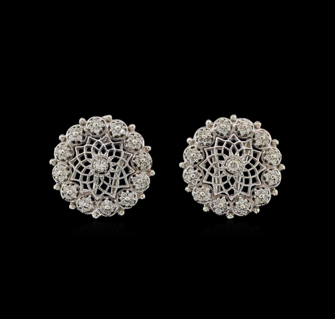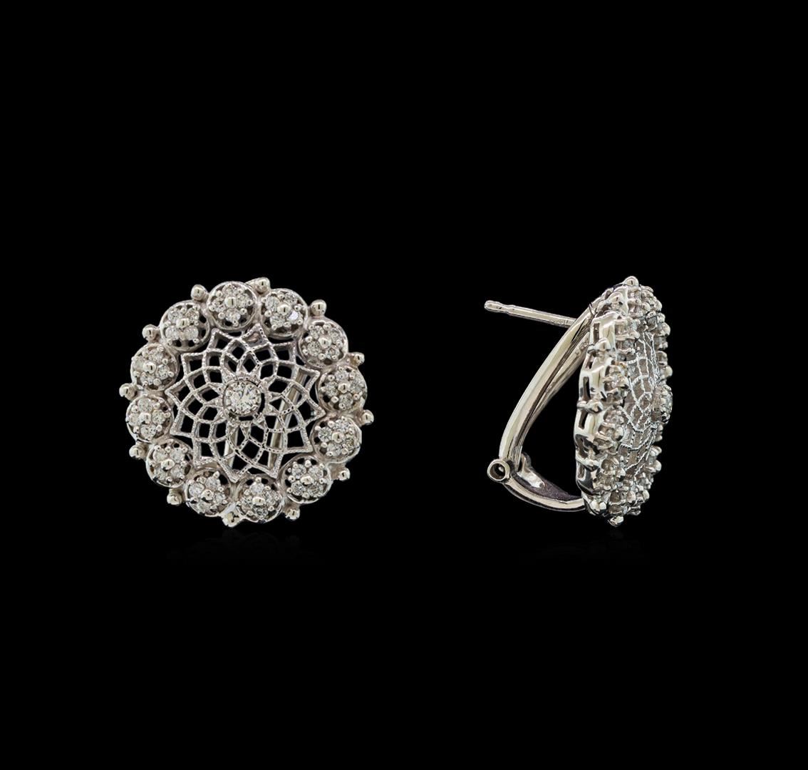 One pair electronically tested 14KT white gold ladies cast diamond earrings with Omega clip backs with a bright polish finish. Identified with markings of "14K". Condition is new. Containing: Ninety-Eight prong set round brilliant cut diamonds, measuring 1.80 - 1.20 x 0.90mm (depth est.) approximate total weight of 98 Stones = 0.74ct. Clarity: SI-2 to I-2. Color: H - I, Cut is Good. All diamonds are graded in the mounting, unless otherwise stated. Total Weight of Diamonds 0.74ct. Total Weight of Earrings 8.40 grams. GGL Appraised at $3,030.00.