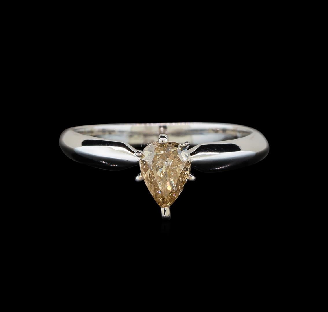One electronically tested 14KT white gold ladies cast diamond solitaire ring with a knife edge shank with a bright polish finish. Identified with markings of "14K". Condition is new. Containing: One prong set pear shaped cut diamond, measuring 6.60 x 4.85 x 3.39mm (depth est.) exact weight 0.76ct. Clarity: I-2, Cut is Good. Diamonds are graded in the mounting, unless otherwise stated. Total Weight of Diamonds 0.76ct. Total Weight of Solitaire Ring 2.60 grams. GGL Appraised.