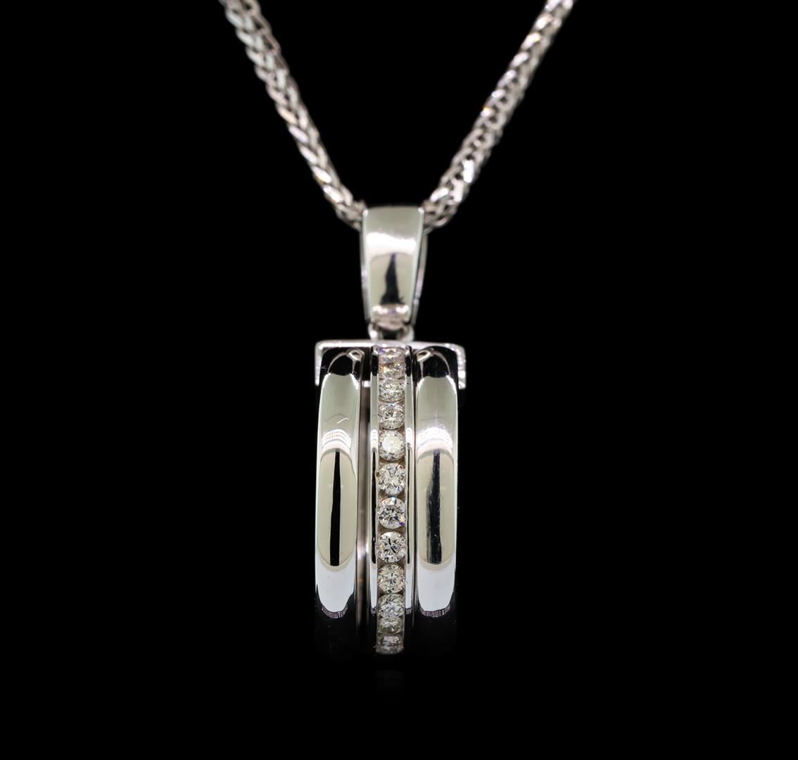 One electronically tested 14KT white gold ladies cast diamond pendant & chain 18.0" long, with a lobster claw clasp with a bright polish finish. Identified with markings of "585". Condition is new. Containing: Twenty-Seven channel set round brilliant cut diamonds, measuring 1.70 - 1.70 x 1.02mm (depth est.) approximate total weight of 27 Stones = 0.77ct. Clarity: SI-1 to SI-2. Color: H - I, Cut is Good. All diamonds are graded in the mounting, unless otherwise stated. Total Weight of Diamonds 0.77ct. Total Weight of Pendant & Chain 11.00 grams. GGL Appraised.