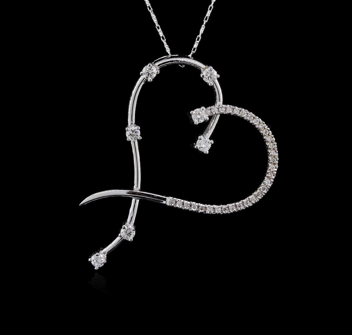 One electronically tested 14KT white gold ladies cast diamond pendant & chain 18.0" long, with a lobster claw clasp with a bright polish finish. Identified with markings of "14KT". Condition is new. Containing: Thirty-Eight prong set round brilliant cut diamonds, measuring 2.60 - 1.30 x 1.17mm (depth est.) approximate total weight of 38 Stones = 0.83ct. Clarity: SI-2 to I-2. Color: H - I, Cut is Good. Diamonds are graded in the mounting, unless otherwise stated. Total Weight of Diamonds 0.83ct. Total Weight of Pendant & Chain 10.00 grams. GGL Appraised at $2,775.00.