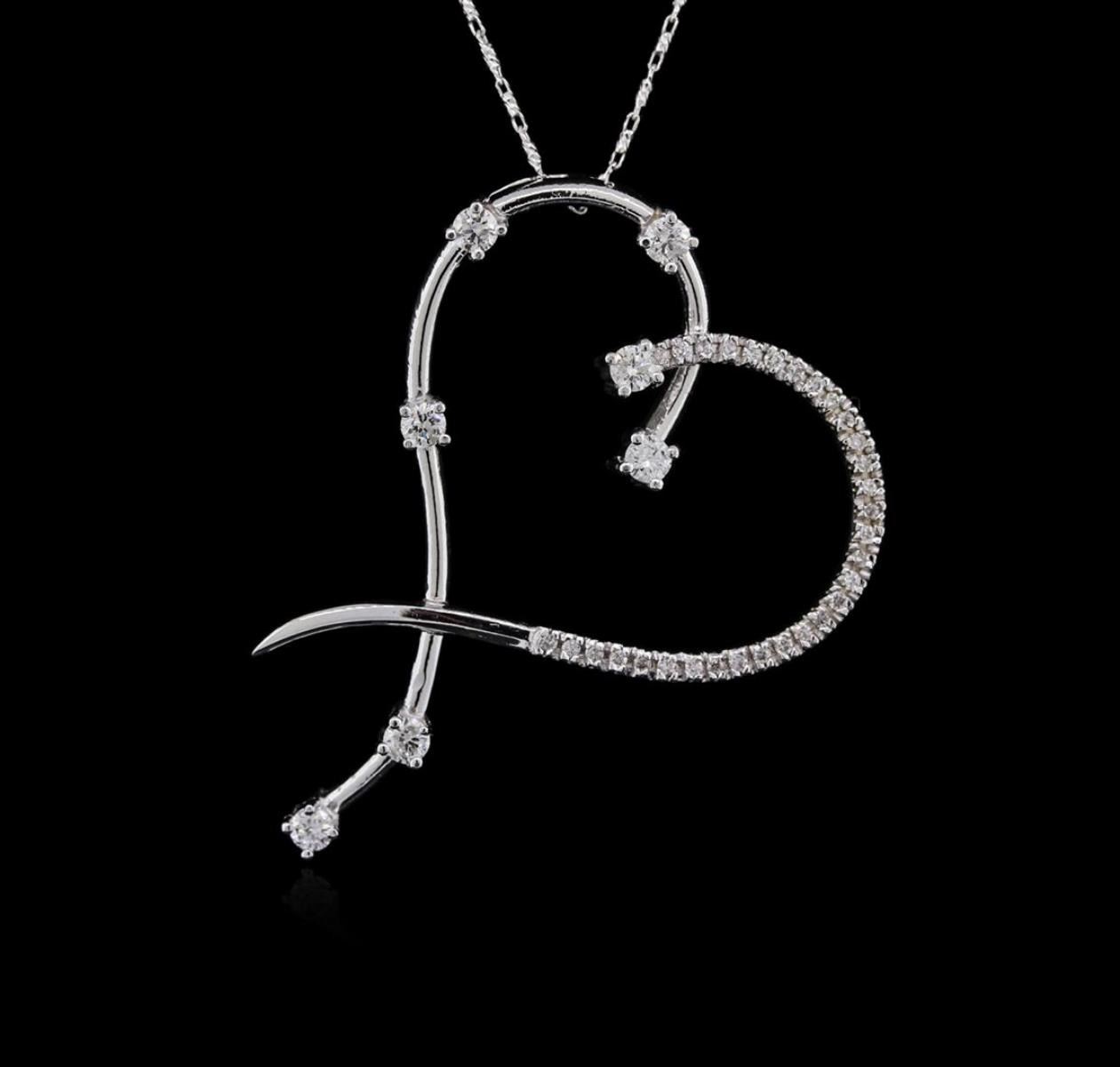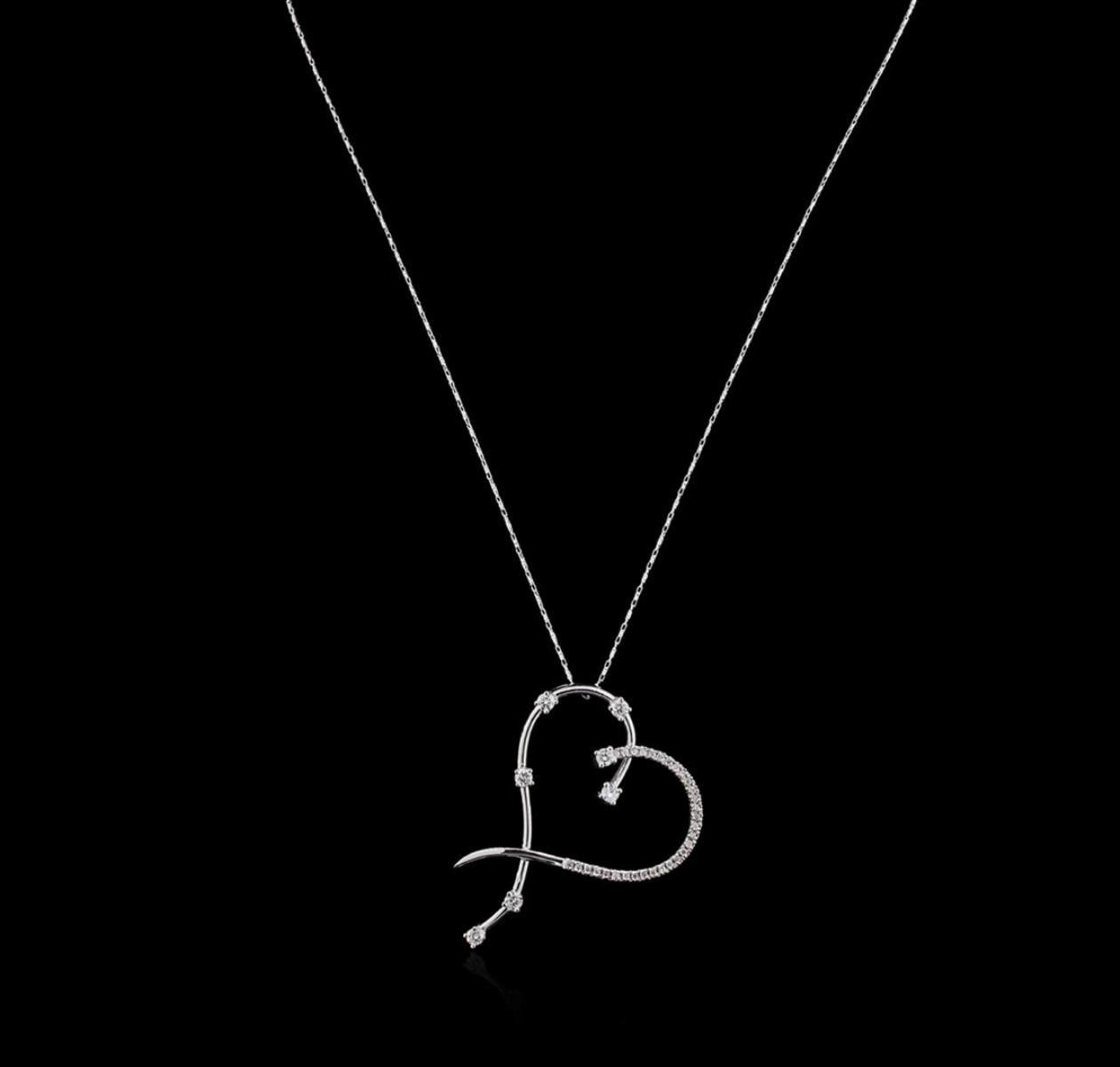 One electronically tested 14KT white gold ladies cast diamond pendant & chain 18.0" long, with a lobster claw clasp with a bright polish finish. Identified with markings of "14KT". Condition is new. Containing: Thirty-Eight prong set round brilliant cut diamonds, measuring 2.60 - 1.30 x 1.17mm (depth est.) approximate total weight of 38 Stones = 0.83ct. Clarity: SI-2 to I-2. Color: H - I, Cut is Good. Diamonds are graded in the mounting, unless otherwise stated. Total Weight of Diamonds 0.83ct. Total Weight of Pendant & Chain 10.00 grams. GGL Appraised.