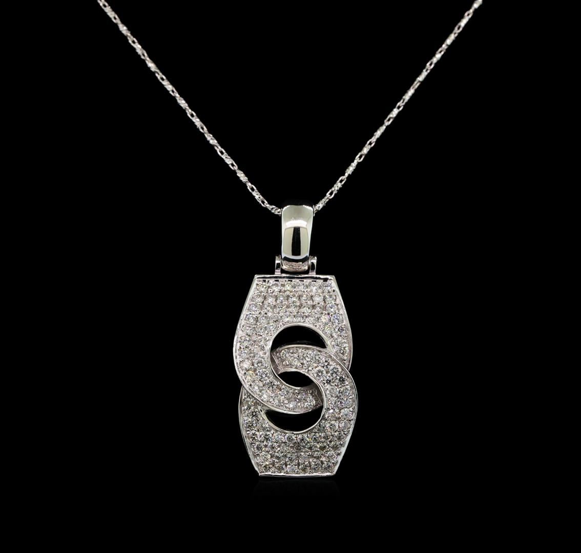One electronically tested 14KT white gold ladies cast diamond pendant & chain 16.0" long, with a lobster claw clasp with a bright polish finish. Identified with markings of "14K". Condition is new. Containing: One Hundred Four bead set round brilliant cut diamonds, measuring 1.30 - 1.30 x 0.78mm (depth est.) approximate total weight of 104 Stones = 0.83ct. Clarity: SI-1 to SI-2. Color: I - J. All diamonds are graded in the mounting, unless otherwise stated. Total Weight of Diamonds 0.83ct. Total Weight of Pendant & Chain 7.60 grams. GGL Appraised.