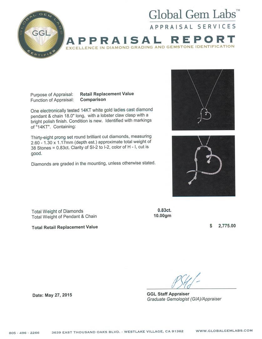 One electronically tested 14KT white gold ladies cast diamond pendant & chain 18.0" long, with a lobster claw clasp with a bright polish finish. Identified with markings of "14KT". Condition is new. Containing: Thirty-Eight prong set round brilliant cut diamonds, measuring 2.60 - 1.30 x 1.17mm (depth est.) approximate total weight of 38 Stones = 0.83ct. Clarity: SI-2 to I-2. Color: H - I, Cut is Good. Diamonds are graded in the mounting, unless otherwise stated. Total Weight of Diamonds 0.83ct. Total Weight of Pendant & Chain 10.00 grams. GGL Appraised.