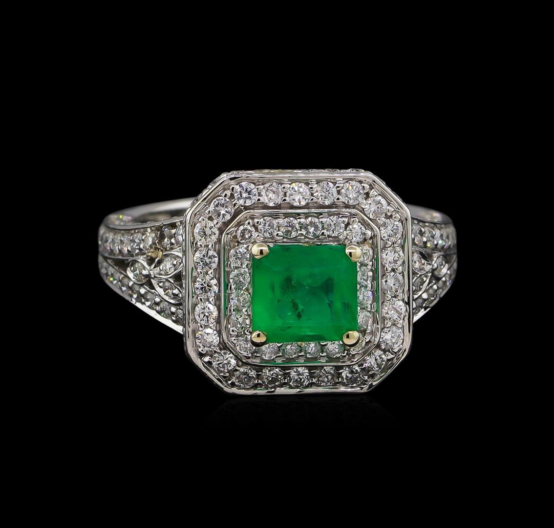 One electronically tested 14KT white gold Ladies combination cast & assembled ring with a bright polish finish. Condition is new. Identified with markings of "14K". Containing: One prong set emerald standard step cut natural emerald, measuring 6.26 x 5.28 x 3.43mm, approximate weight of 0.83ct., clarity is moderately included, type III, medium, moderately strong, green color, (GIA G 5/4), cut is good. Colored gemstones are presumed to have been subjected to commonly used color/clarity enhancement processes. One Hundred Forty prong set round brilliant cut diamonds, measuring 1.40 - 1.10 x 0.75mm (depth est.) approximate. Total Weight of 140 Stones = 0.99ct. . Clarity: I-1 to I-2. Color: H - I, Cut is Good. Total Weight of Colored Stones 0.83ct. Total Weight of Diamonds 0.99ct. Total Weight of Ring 7.00 grams. GGL Appraised.