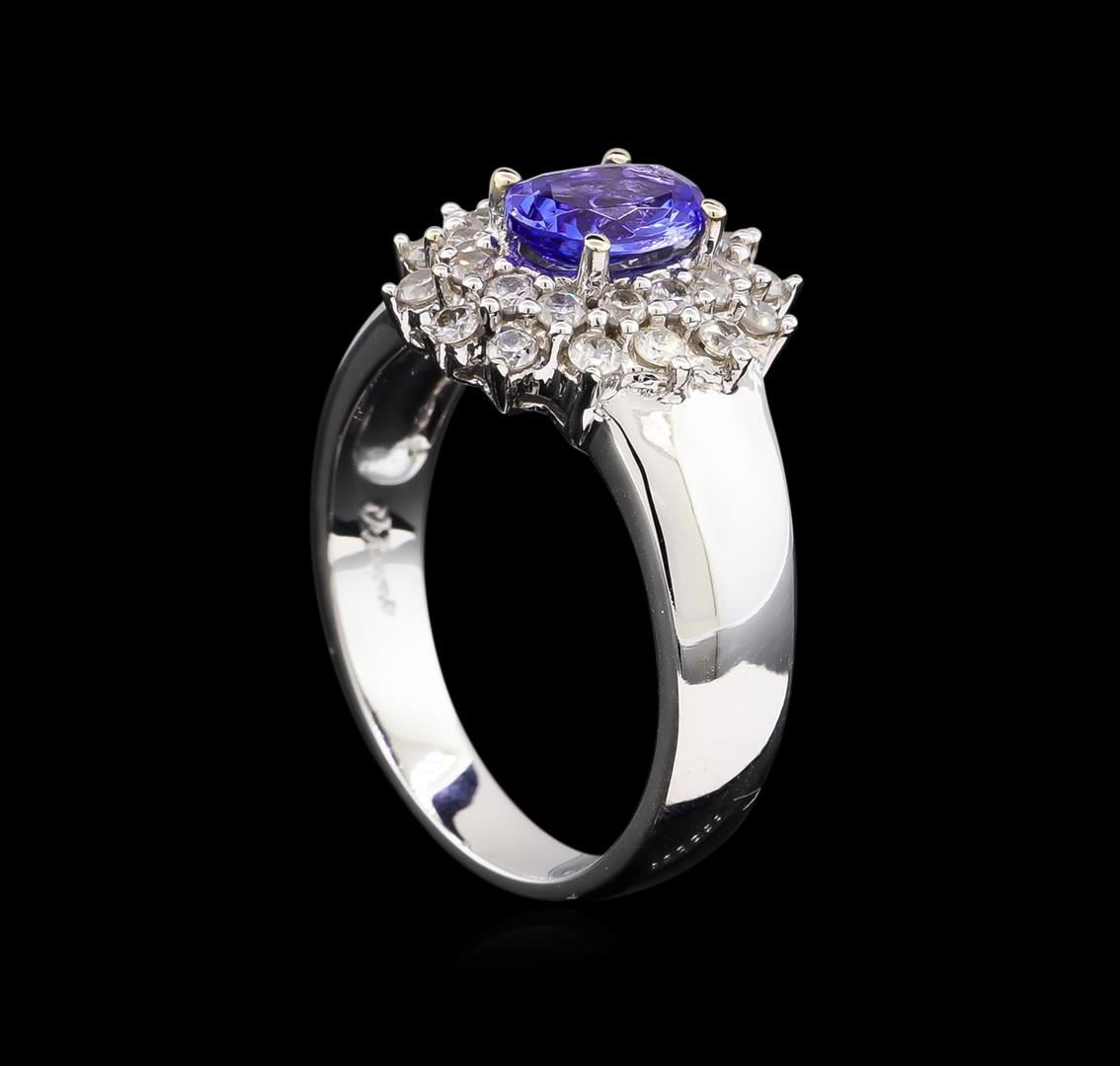 One electronically tested 14KT white gold Ladies combination cast & assembled ring with a bright polish finish. Condition is new. Identified with markings of "14K". Containing: One prong set oval modified brilliant cut natural tanzanite, measuring 7.00 x 5.00 x 3.25mm, approximate weight of 0.83ct., clarity is eye clean, type I, medium, very slightly grayish, violet color, (GIA V 5/3), cut is very good. Colored gemstones are presumed to have been subjected to commonly used color/clarity enhancement processes. Twenty-Eight prong set round brilliant cut diamonds, measuring 2.00 - 2.00 x 1.20mm (depth est.) approximate. Total Weight of 28 Stones = 0.57ct. Clarity: I-1 to I-2. Color: I - J, Cut is Good. Total Weight of Colored Stones 0.83ct. Total Weight of Diamonds 0.57ct. Total Weight of Ring 6.40 grams. GGL Appraised.