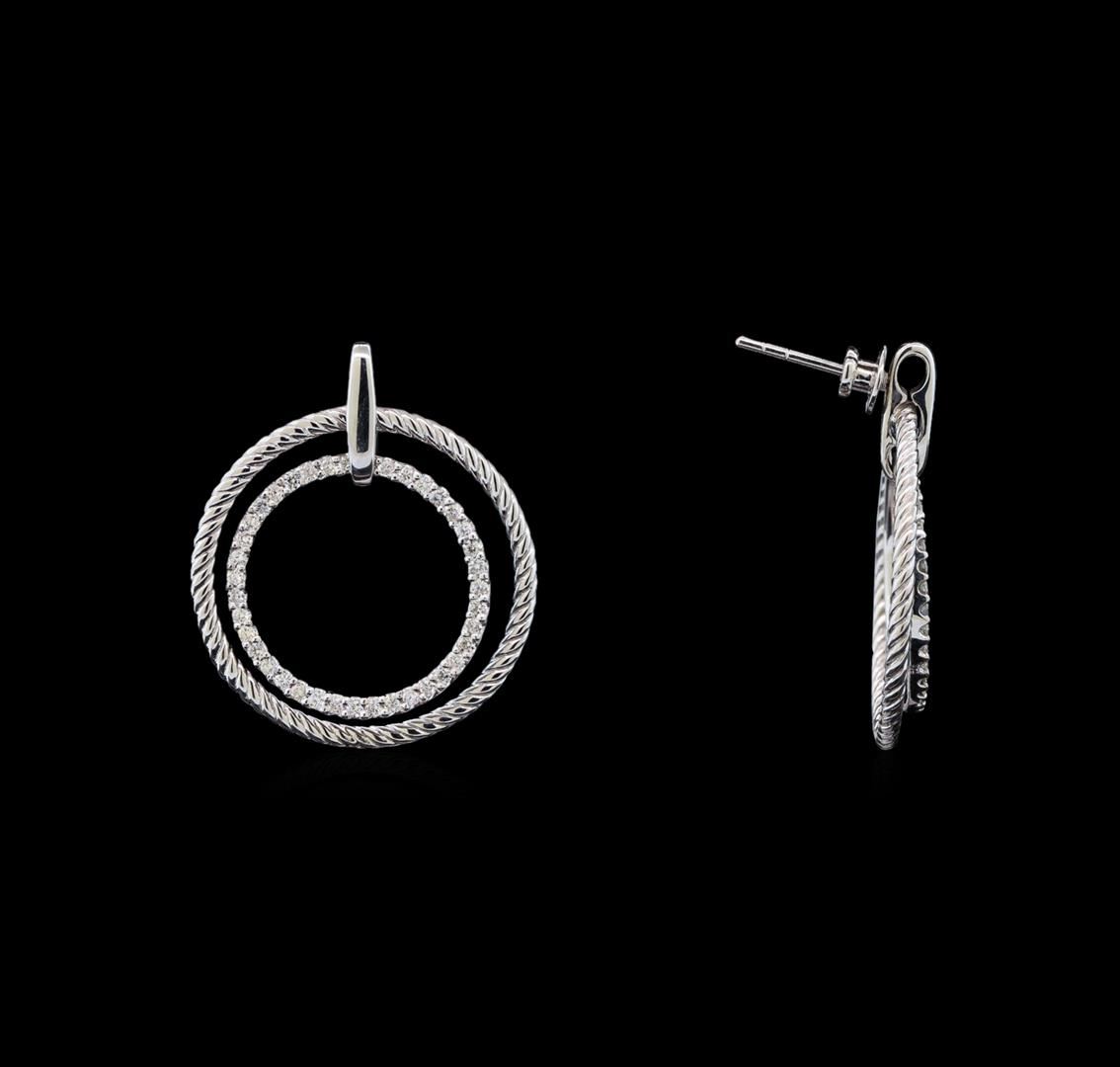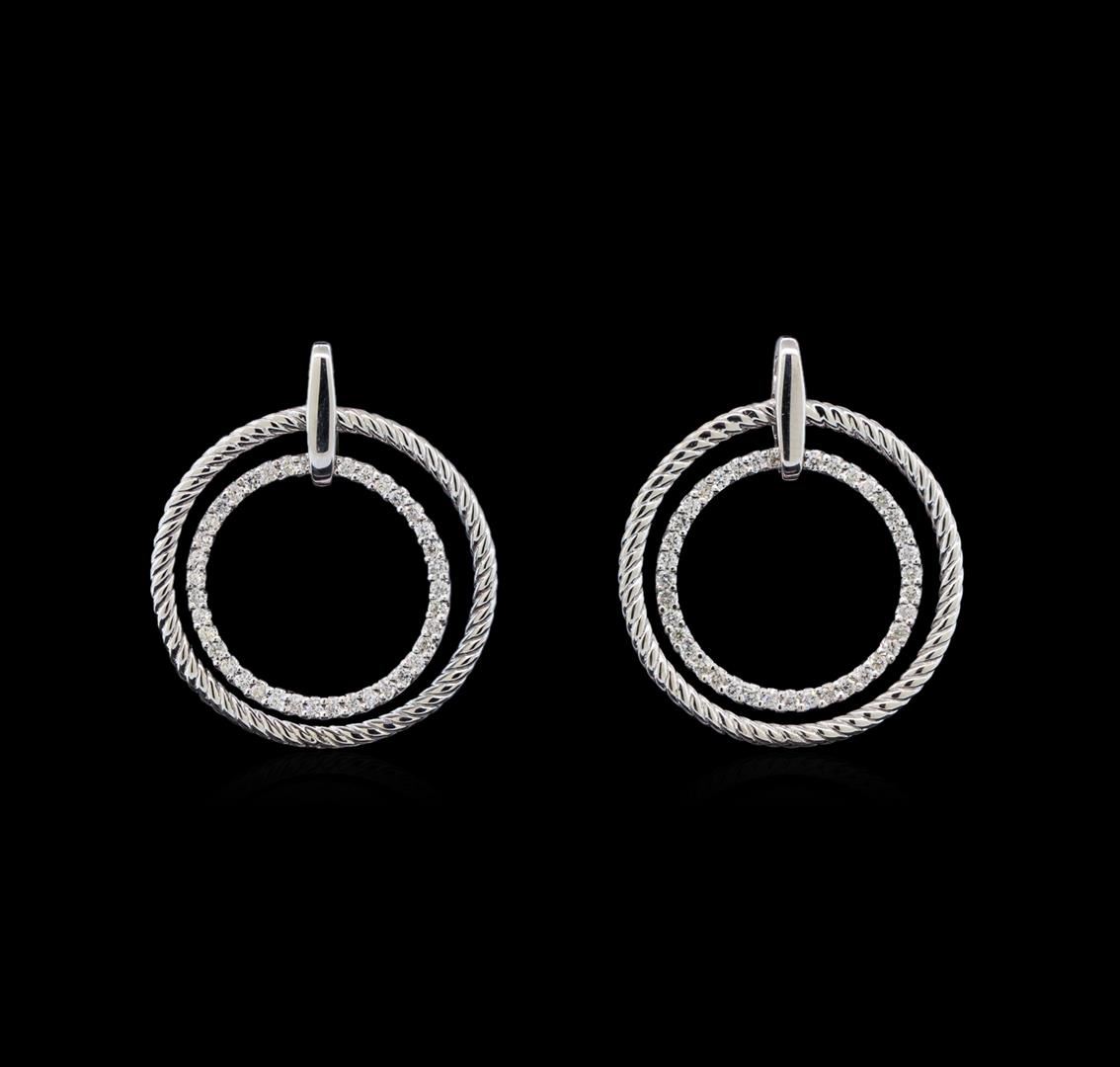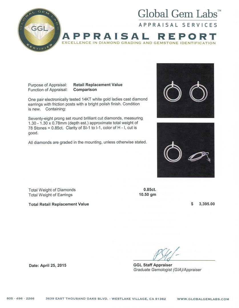 One pair electronically tested 14KT white gold ladies cast diamond earrings with friction posts with a bright polish finish. Condition is new. Containing: Seventy-Eight prong set round brilliant cut diamonds, measuring 1.30 - 1.30 x 0.78mm (depth est.) approximate total weight of 78 Stones = 0.85ct. Clarity: SI-1 to I-1. Color: H - I, Cut is Good. All diamonds are graded in the mounting, unless otherwise stated. Total Weight of Diamonds 0.85ct. Total Weight of Earrings 10.50 grams. GGL Appraised at $3,395.00.