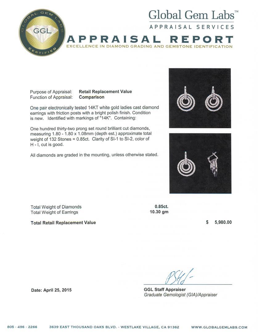 One pair electronically tested 14KT white gold ladies cast diamond earrings with friction posts with a bright polish finish. Identified with markings of "14K". Condition is new. Containing: One Hundred Thirty-Two prong set round brilliant cut diamonds, measuring 1.80 - 1.80 x 1.08mm (depth est.) approximate total weight of 132 Stones = 0.85ct. Clarity: SI-1 to SI-2. Color: H - I, Cut is Good. All diamonds are graded in the mounting, unless otherwise stated. Total Weight of Diamonds 0.85ct. Total Weight of Earrings 10.30 grams. GGL Appraised.