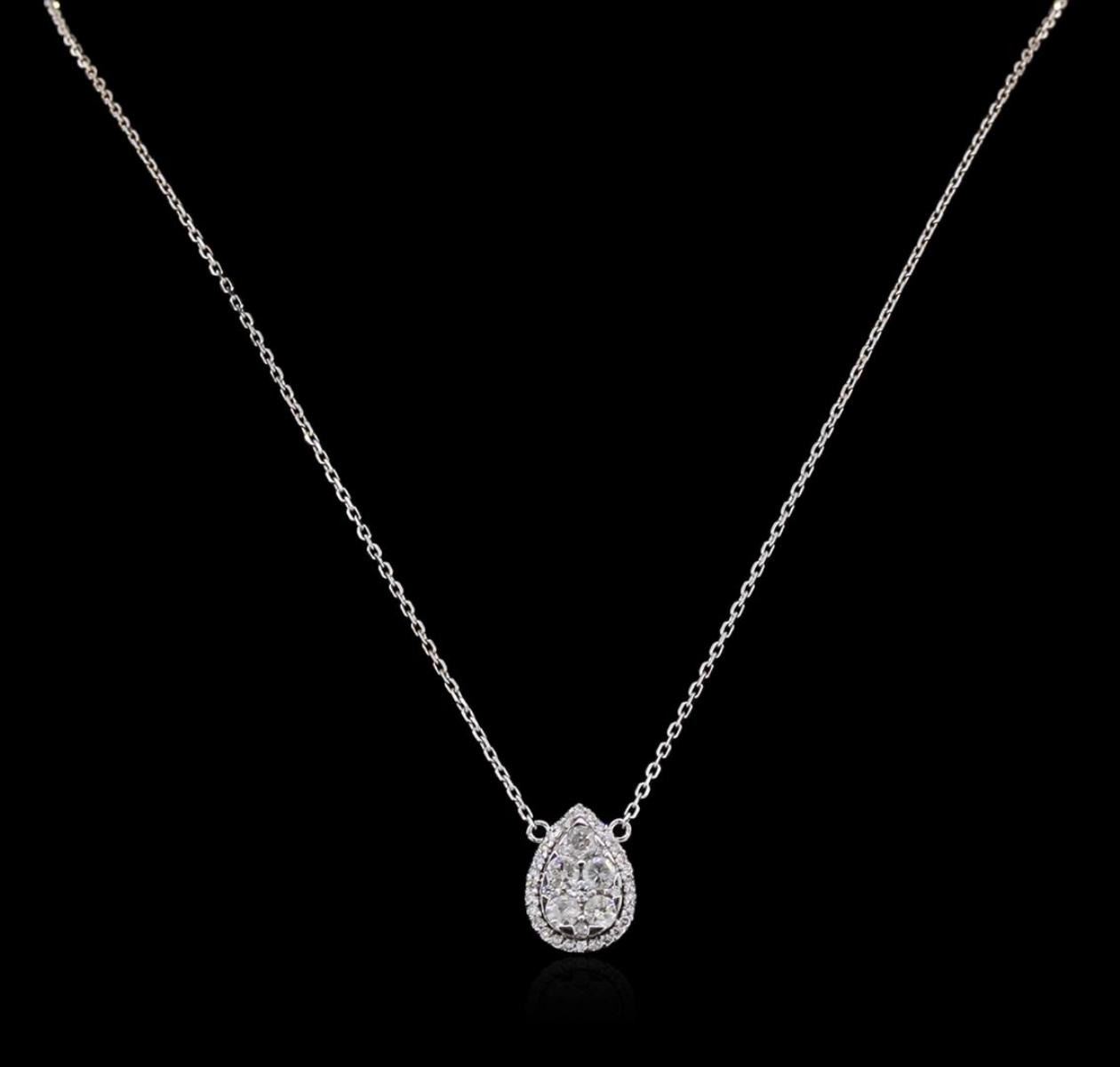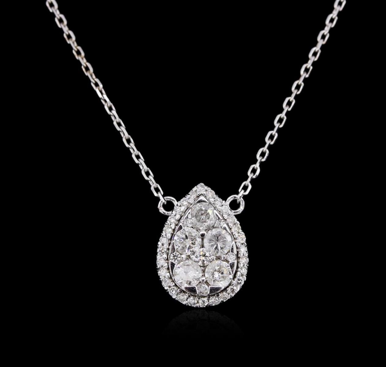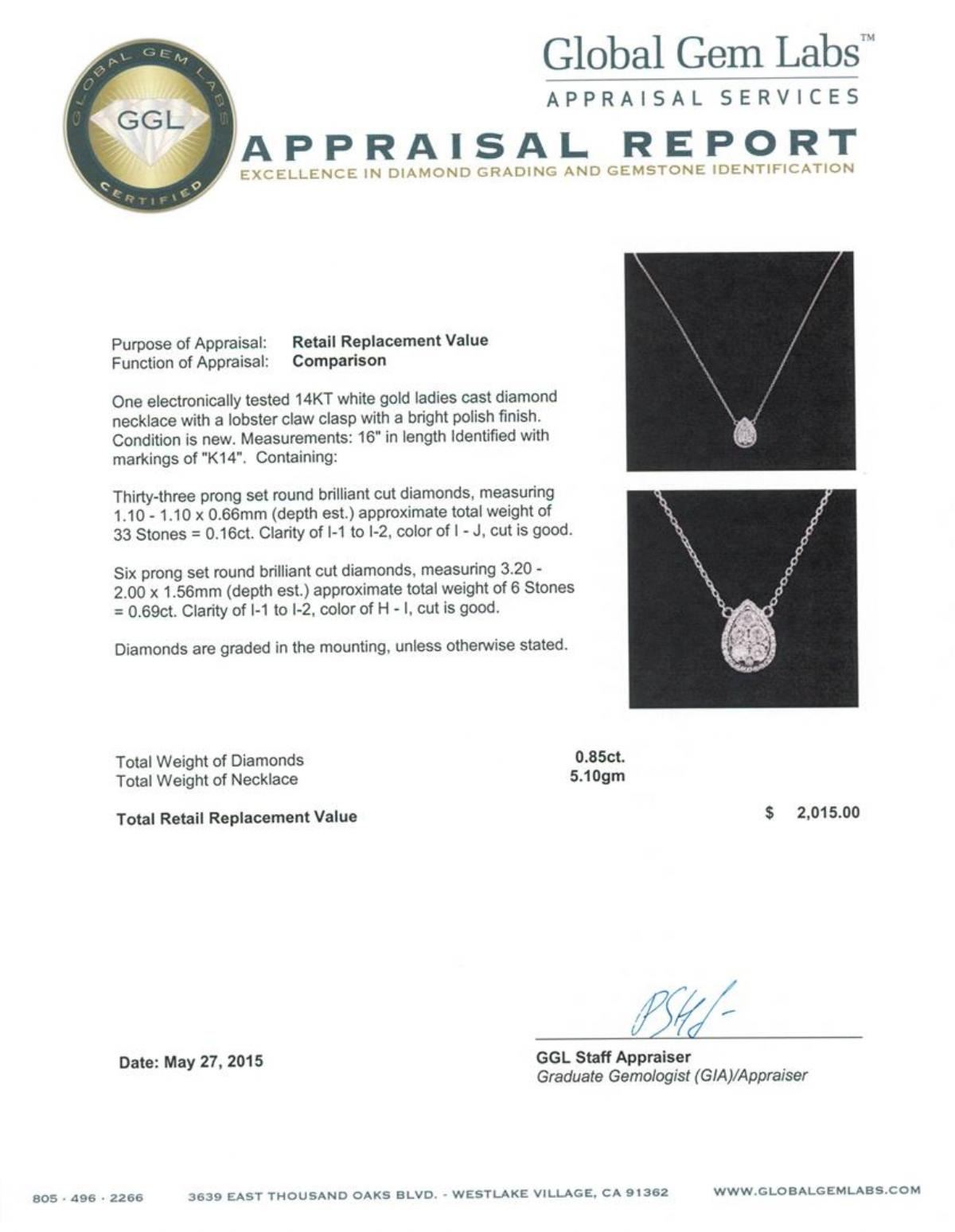 One electronically tested 14KT white gold ladies cast diamond necklace with a lobster claw clasp with a bright polish finish. Measurements: 16" in length Identified with markings of "K14". Condition is new. Containing: Thirty-Three prong set round brilliant cut diamonds, measuring 1.10 - 1.10 x 0.66mm (depth est.) approximate total weight of 33 Stones = 0.16ct. Clarity: I-1 to I-2. Color: I - J, Cut is Good. Six prong set round brilliant cut diamonds, measuring 3.20 - 2.00 x 1.56mm (depth est.) approximate total weight of 6 Stones = 0.69ct. Clarity: I-1 to I-2. Color: H - I, Cut is Good. Diamonds are graded in the mounting, unless otherwise stated. Total Weight of Diamonds 0.85ct. Total Weight of Necklace 5.10 grams. GGL Appraised at $2,015.00.