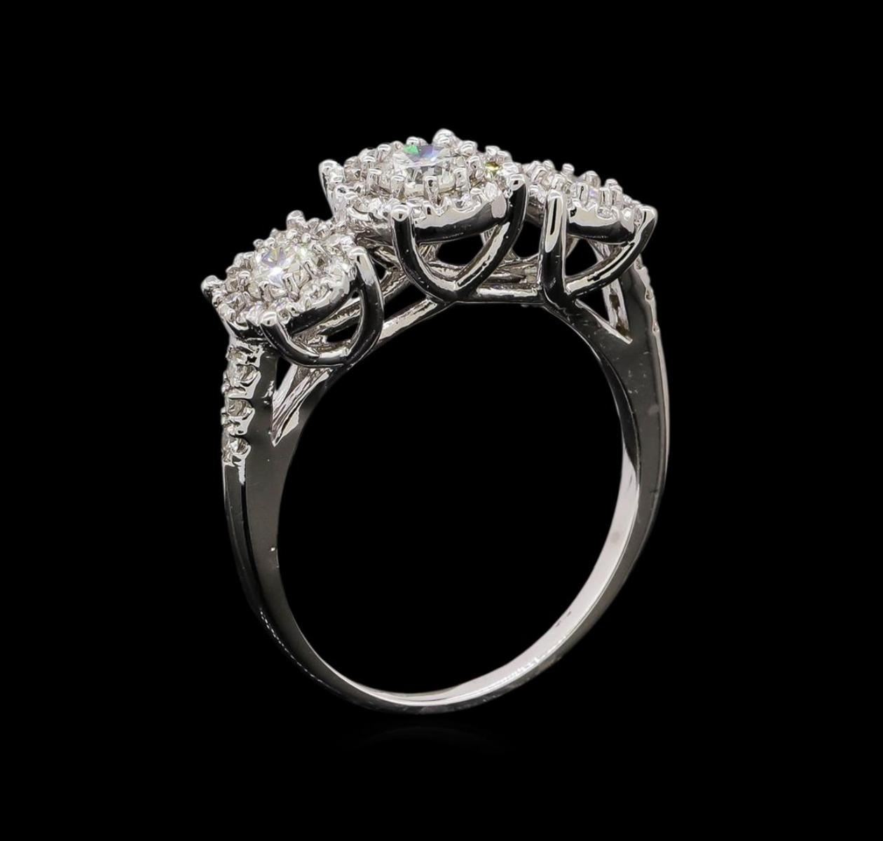 One electronically tested 14KT white gold ladies cast diamond engagement ring with a bright polish finish. Identified with markings of "14K". Condition is new. Containing: One prong set round brilliant cut diamond, measuring 4.10 - 4.10 x 2.46mm (depth est.) approximate weight of 0.25ct. Clarity: I-1. Color: I, Cut is Good. Two prong set round brilliant cut diamonds, measuring 3.50 - 3.50 x 2.10mm (depth est.) approximate total weight of 2 Stones = 0.31ct. Clarity: SI-2 to I-1. Color: J, Cut is Good. Thirty-One prong set round brilliant cut diamonds, measuring 1.40 - 1.30 x 0.81mm (depth est.) approximate total weight of 31 Stones = 0.28ct. Clarity: SI-2 to I-1. Color: I - J, Cut is Good. All diamonds are graded in the mounting, unless otherwise stated. Total Weight of Diamonds 0.85ct. Total Weight of Engagement Ring 4.10 grams. GGL Appraised.