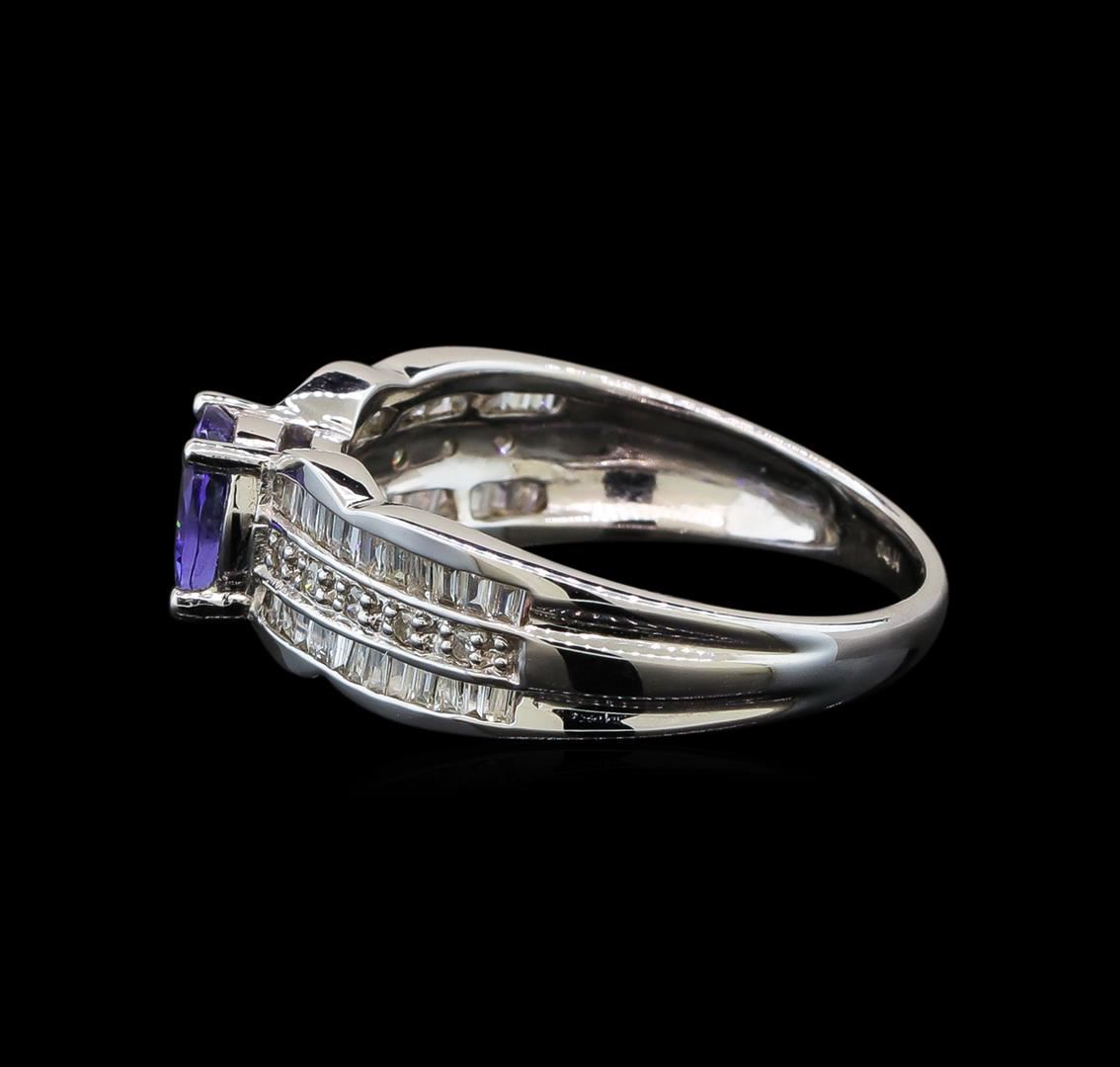 One electronically tested 14KT white gold ladies cast tanzanite and diamond ring with a bright polish finish. Identified with markings of "14K". Condition is new. Containing: One prong set round modified brilliant cut natural tanzanite, measuring 5.80 - 5.80 x 3.77 mm, approximate weight of 0.85ct., clarity is eye clean, type I, medium light, very slightly grayish, violet color, (GIA V 4/3), cut is good. Ten prong set round brilliant cut diamonds, measuring 1.10 - 1.10 x 0.66mm (depth est.) approximate total weight of 10 Stones = 0.05ct. Clarity: SI-2 to I-1. Color: I - J. Forty-Eight channel set baguette cut diamonds, measuring 1.30 x 1.00 x 0.85mm (depth est.) approximate total weight of 48 Stones = 0.49ct. Clarity: I-1 to I-2. Color: I - J. Colored gemstones are presumed to have been subjected to commonly used enhancement processes. All diamonds and colored gemstones are graded in the mounting, unless otherwise stated. Total Weight of Colored Stones 0.85ct. Total Weight of Diamonds 0.53ct. Total Weight of Ring 3.20 grams. GGL Appraised.