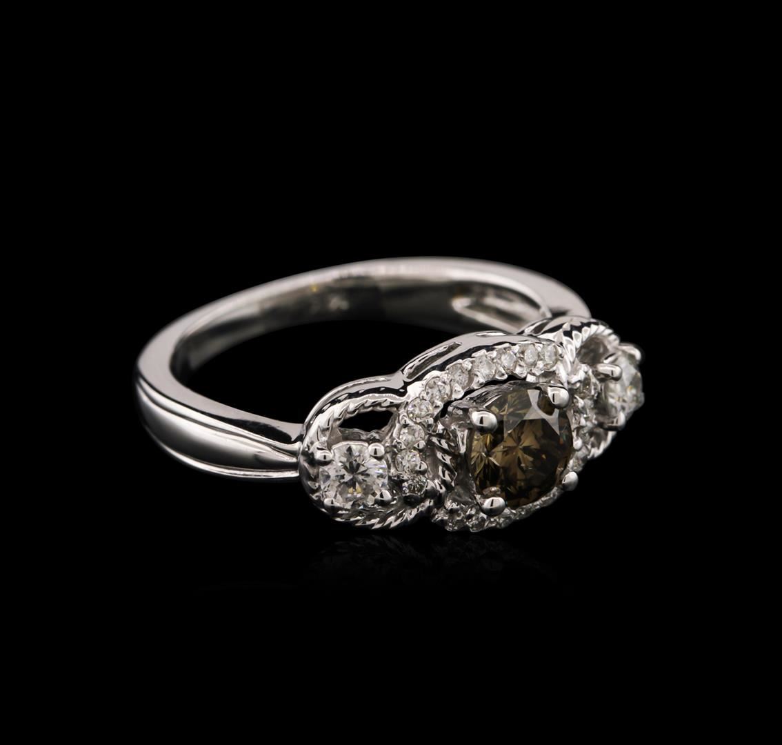 One electronically tested 14KT white gold ladies cast diamond ring with a bright polish finish. Identified with markings of "14K". Condition is new. Containing: One prong set round brilliant cut diamond, measuring 5.00 - 5.00 x 3.00mm (depth est.) approximate weight of 0.55ct. Clarity: SI-2, Cut is Good. Two prong set round brilliant cut diamonds, measuring 3.00 - 3.00 x 1.80mm (depth est.) approximate total weight of 2 Stones = 0.20 ct. Clarity: I-1. Color: H - I, Cut is Good. Twenty prong set round brilliant cut diamonds, measuring 1.10 - 1.10 x 0.66mm (depth est.) approximate total weight of 20 Stones = 0.12ct. Clarity: I-1 to I-2. Color: H - I, Cut is Good. Diamonds are graded in the mounting, unless otherwise stated. Total Weight of Diamonds 0.87ct. Total Weight of Ring 3.60 grams. GGL Appraised.