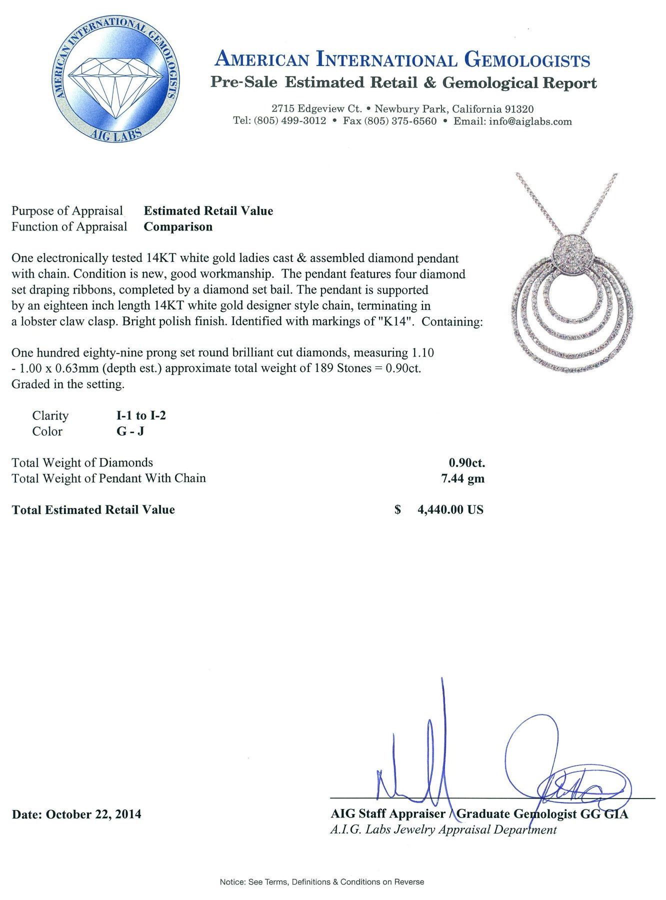 One electronically tested 14KT white gold ladies cast & assembled diamond pendant with chain. The pendant features four diamond set draping ribbons, completed by a diamond set bail. The pendant is supported by an eighteen inch length 14KT white gold designer style chain, terminating in a lobster claw clasp. Bright polish finish. Identified with markings of "K14". Condition is new, good workmanship. Containing: One Hundred Eighty-Nine prong set round brilliant cut diamonds, measuring 1.10 - 1.00 x 0.63mm (depth est.) approximate total weight of 189 Stones = 0.90ct. Graded in the setting. Clarity: I-1 to I-2. Color: G - J. Total Weight of Diamonds 0.90ct. Total Weight of Pendant With Chain 7.44 grams. AIG Appraised.