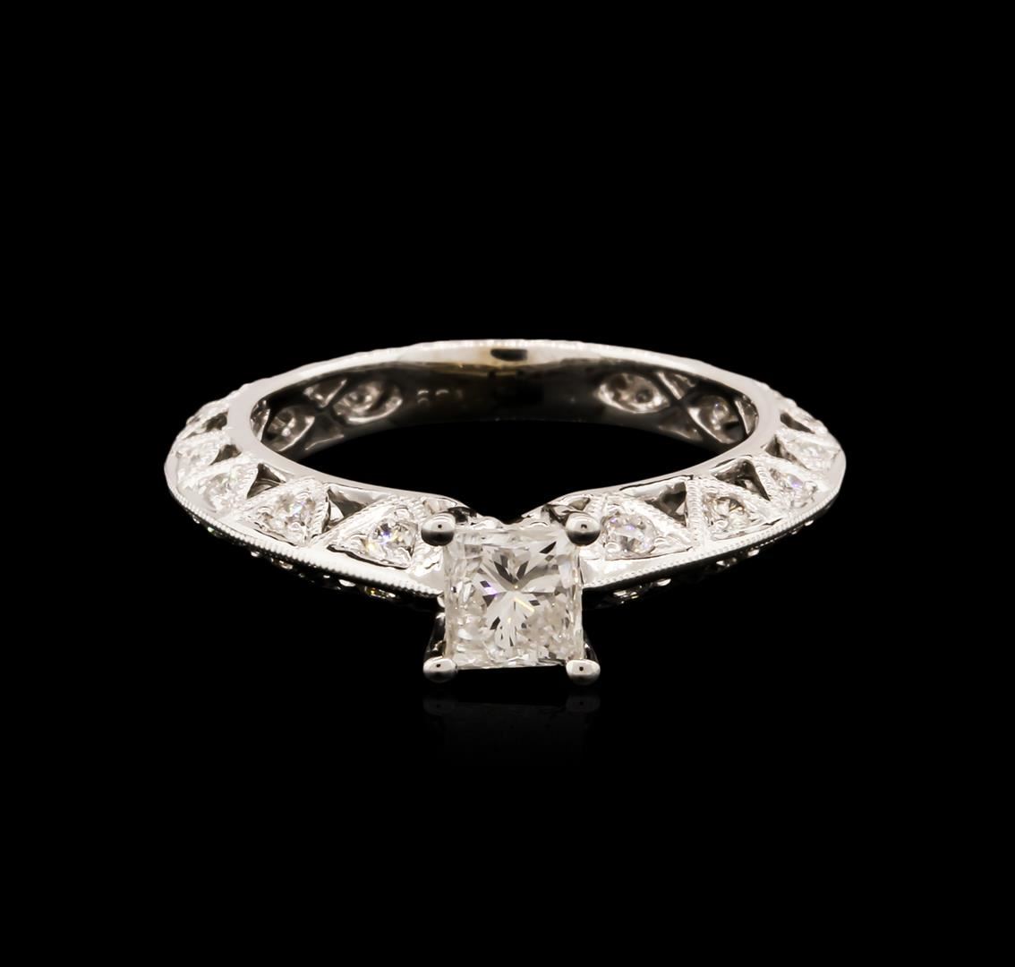 One electronically tested 14KT white gold ladies cast diamond engagement ring with a bright polish finish. Condition is new. Containing: One prong set princess cut diamond, measuring 4.50 x 4.30 x 3.23mm (depth est.) approximate weight of 0.51ct. Clarity: I-2. Color: J, Cut is Good. Thirty-Two prong set round brilliant cut diamonds, measuring 2.10 - 1.30 x 1.02mm (depth est.) approximate total weight of 32 Stones = 0.40ct. Clarity: SI-1 to SI-2. Color: J, Cut is Good. All diamonds are graded in the mounting, unless otherwise stated. Total Weight of Diamonds 0.91ct. Total Weight of Engagement Ring 3.60 grams. GGL Appraised.