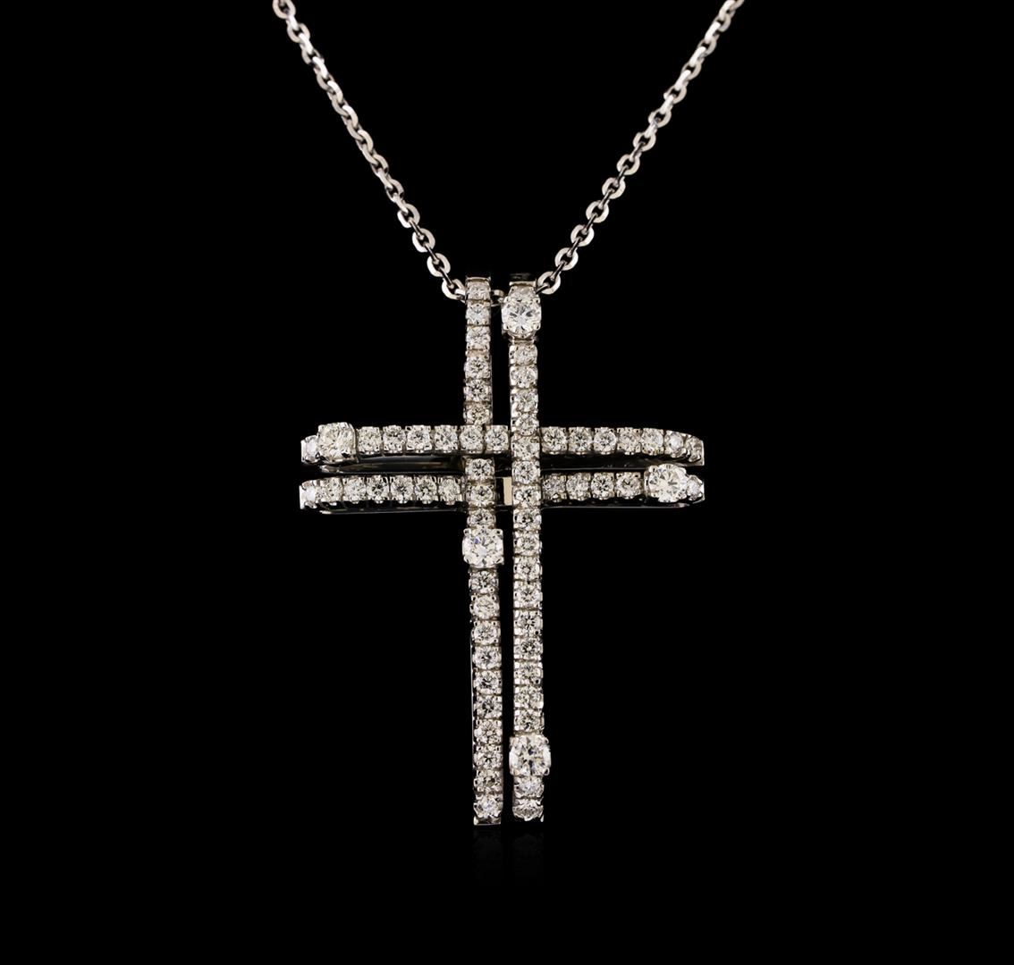 One electronically tested 14KT white gold ladies combination cast & assembled cross pendant & chain 18.0 long, medium cable link with a lobster claw clasp with a bright polish finish. Identified with markings of 14K. Condition is new. Containing: Sixty-Four prong set round brilliant cut diamonds, measuring 1.40 - 1.40 x 0.84mm (depth est.) approximate total weight of 64 Stones = 0.64ct. Clarity: SI-1 to I-1. Color: I - J, Cut is Good. Five prong set round brilliant cut diamonds, measuring 2.50 - 2.50 x 1.50mm (depth est.) approximate total weight of 5 Stones = 0.29ct. Clarity: SI-1 to SI-2. Color: H - I, Cut is Good. All diamonds are graded in the mounting, unless otherwise stated. Total Weight of Diamonds 0.93ct. Total Weight of Pendant & Chain 9.76 grams. GGL Appraised at $5,055.00.