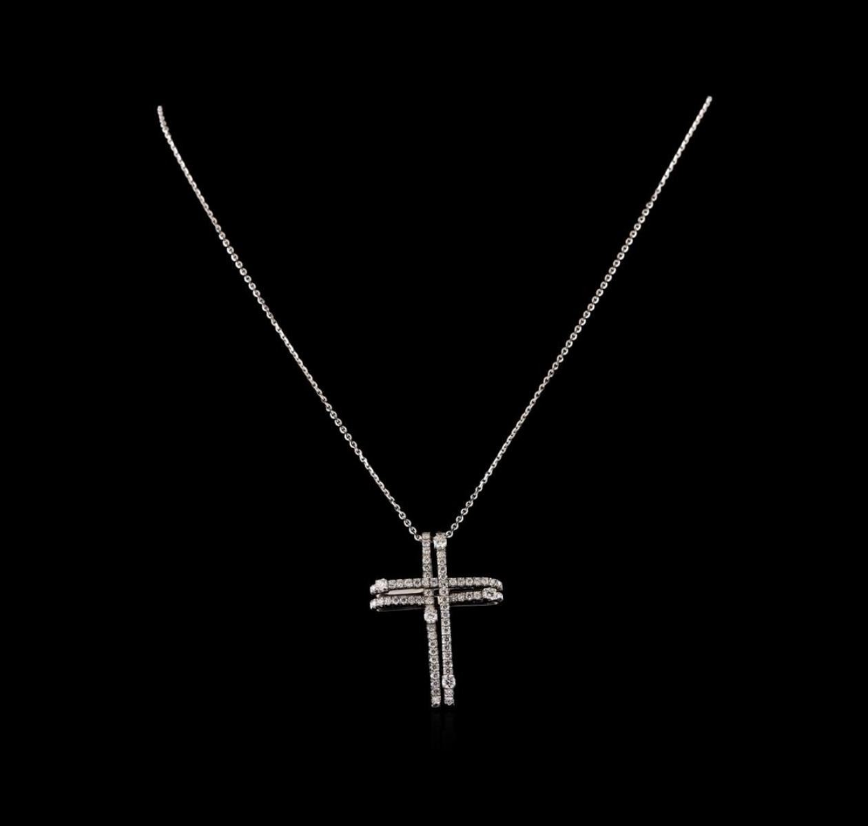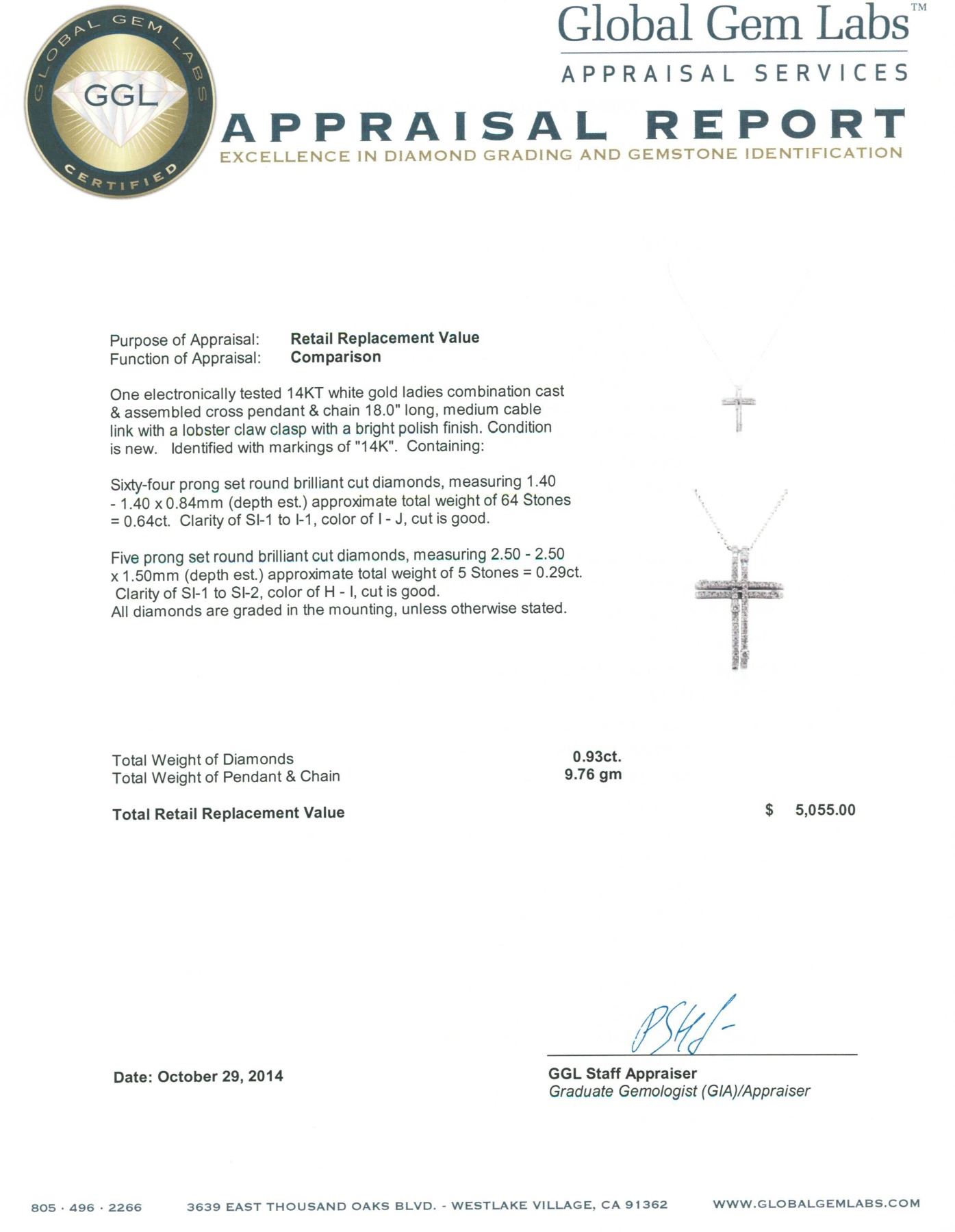 One electronically tested 14KT white gold ladies combination cast & assembled cross pendant & chain 18.0 long, medium cable link with a lobster claw clasp with a bright polish finish. Identified with markings of 14K. Condition is new. Containing: Sixty-Four prong set round brilliant cut diamonds, measuring 1.40 - 1.40 x 0.84mm (depth est.) approximate total weight of 64 Stones = 0.64ct. Clarity: SI-1 to I-1. Color: I - J, Cut is Good. Five prong set round brilliant cut diamonds, measuring 2.50 - 2.50 x 1.50mm (depth est.) approximate total weight of 5 Stones = 0.29ct. Clarity: SI-1 to SI-2. Color: H - I, Cut is Good. All diamonds are graded in the mounting, unless otherwise stated. Total Weight of Diamonds 0.93ct. Total Weight of Pendant & Chain 9.76 grams. GGL Appraised at $5,055.00.